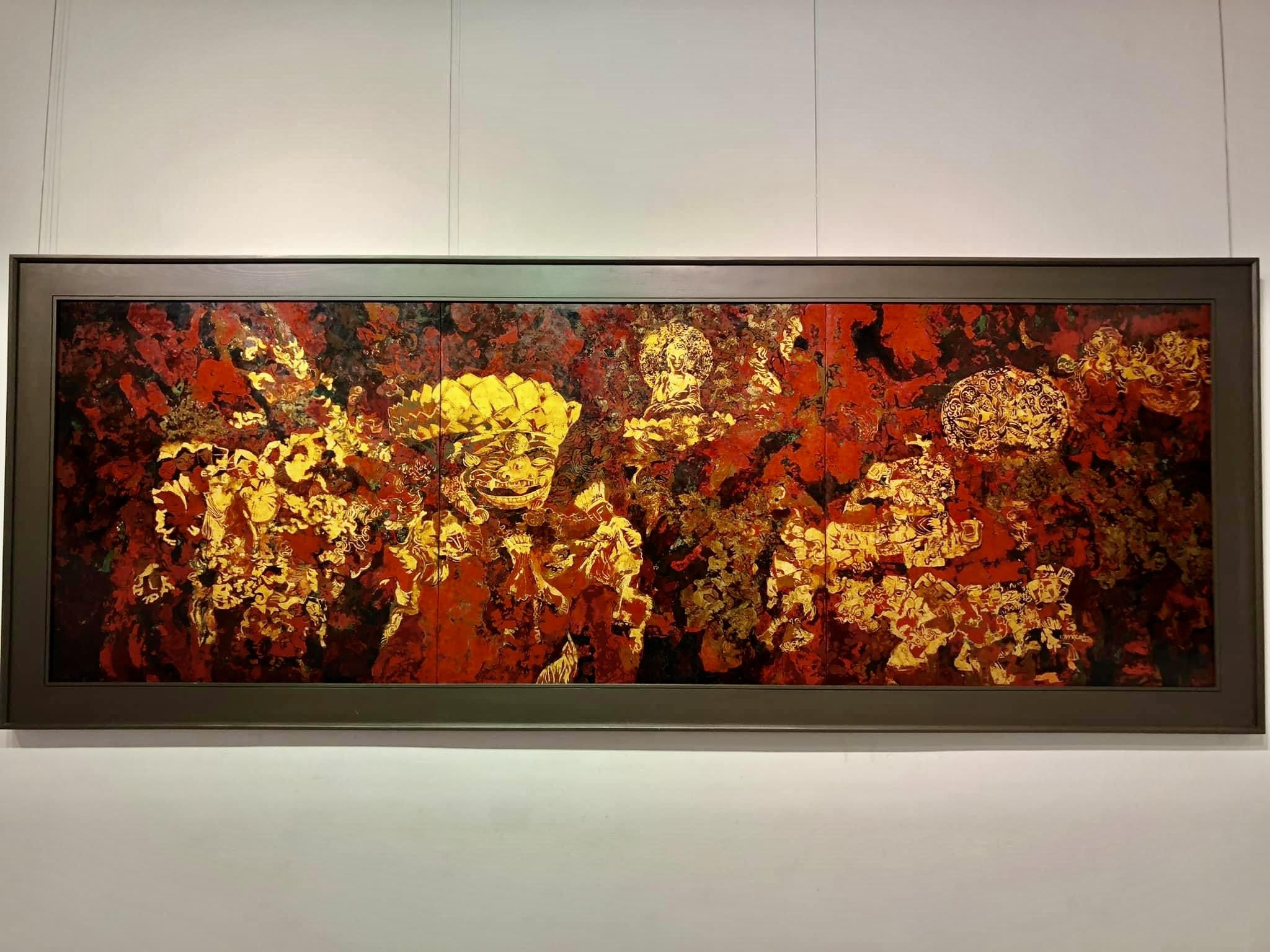 Giữa phông nền màu đỏ tượng trưng cho may mắn, hạnh phúc và sức mạnh ở phương Đông, hình ảnh của con lân to lớn, Đức Phật trang nghiêm ngồi trên tòa sen hiện lên rõ ràng bằng gam màu vàng, đại diện cho nền văn hóa truyền thống Việt Nam. Xen kẽ, nhấp nhô trong không gian huyền ảo, là con người nhỏ bé tiệp màu với các đức tối cao đang hòa quyện vào không khí tâm linh cổ truyền bao trùm toàn bộ bức tranh.