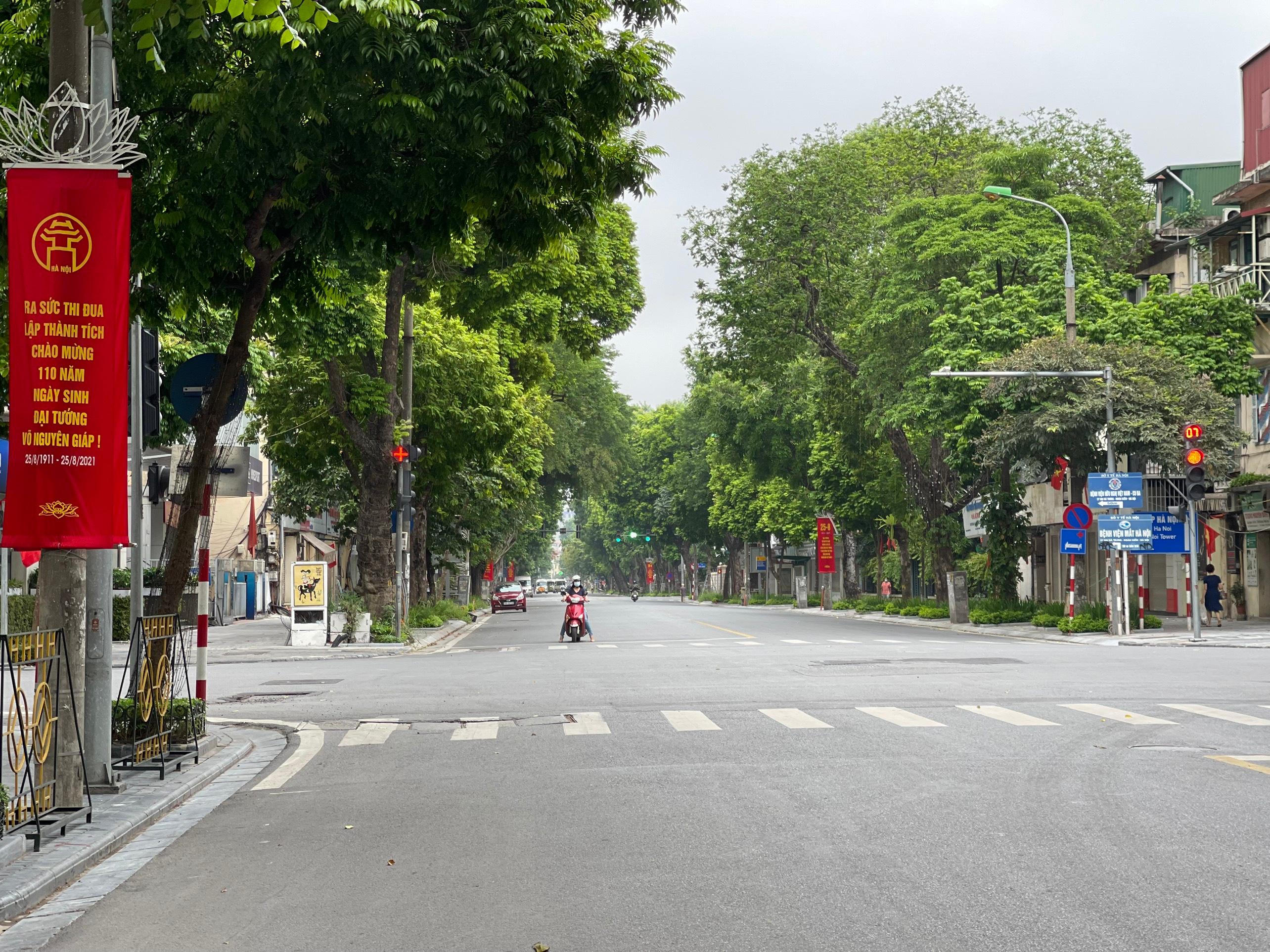 Tại ngã tư Hai Bà Trưng - Phan Bội Châu, hàng quán đóng cửa do dịch bệnh COVID-19. Người dân thể hiện lòng yêu nước của mình trong ngày lễ lớn của dân tộc bằng cách treo những lá cờ đỏ sao vàng trước nhà. Ảnh: Mỵ Châu