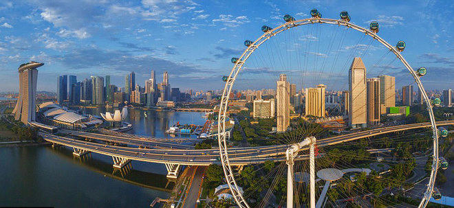 Toàn cảnh quốc đảo sư tử Singapore với vòng quay khổng lồ và tòa nhà Marina Bay Sands phía xa xa.