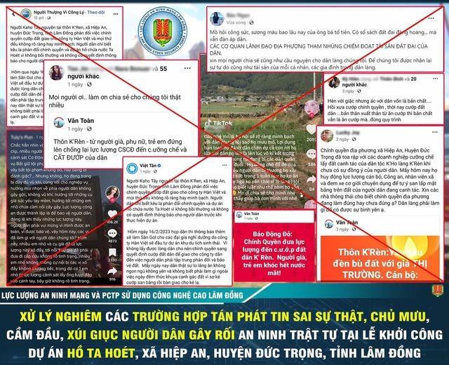 Đồng thời, các cơ quan chức năng xác định, thông tin cho rằng “người dân tộc K’Ho ở thôn K’Rèn, xã Hiệp An, huyện Đức Trọng bị chính quyền cướp đất”, “chính quyền cướp đất để giao cho doanh nghiệp…” là sai sự thật, do các trang phản động, tổ chức khủng bố cố tình loan tin để kích động, xúi bẩy người dân chống phá chính quyền; chống đối, không bàn giao mặt bằng, cản trở việc thi công dự án.