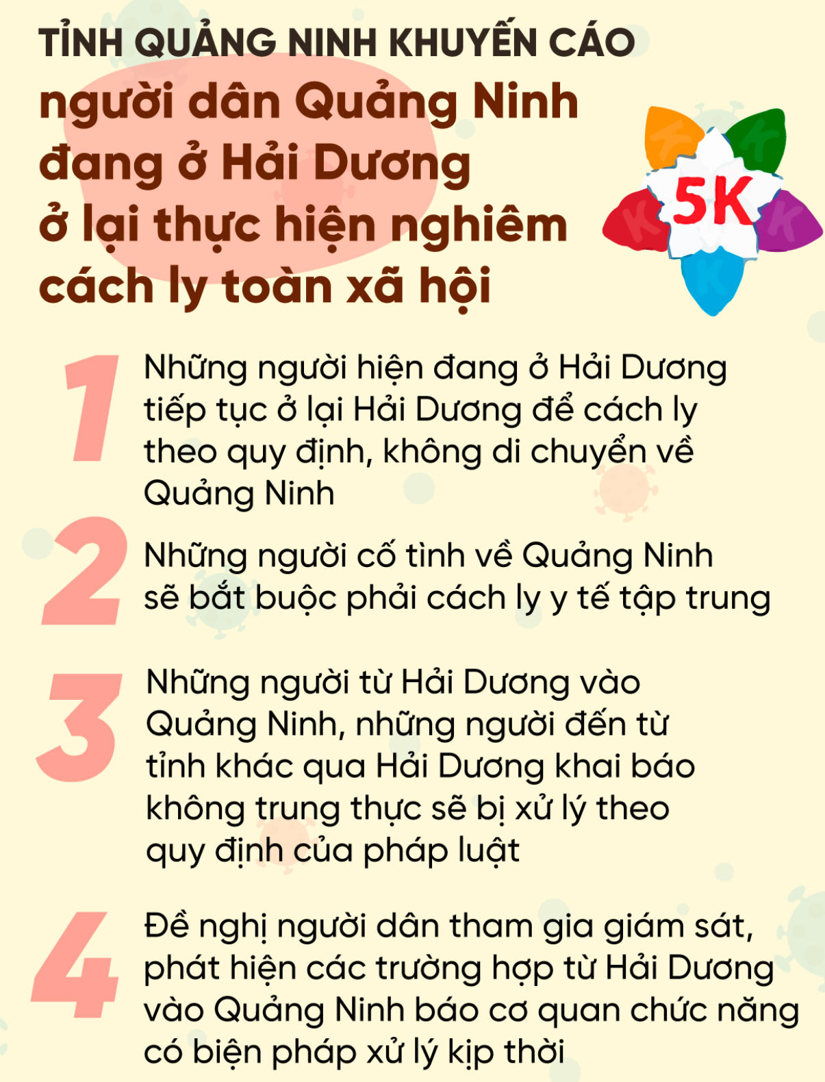 Những người cố tình về Quảng Ninh sẽ bị bắt buộc cách ly y tế tập trung. Những người từ Hải Dương về khai báo không trung thực hoặc cố tình đi qua các tỉnh khác để không khai báo y tế vào tỉnh sẽ bị xử lý theo quy định của pháp luật.
