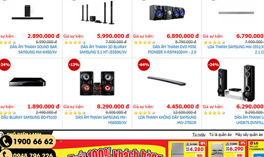 Những mặt hàng được giảm giá “sâu” này là điều hòa, tủ lạnh, tivi, loa không dây,.... Ví dụ như sản phẩm điều hòa mang nhãn hiệu Mitsubishi Heavy có mã hàng SRK/SRC09CRR 1 chiều 9000 BTU với giá chính hãng gần 8 triệu đồng nhưng lại được treo giá sự kiện chỉ 50.000 đồng, giảm giá tới 99%. Loa thanh không dây SamSung HW-J7501R có mức giảm giá sâu tới 64%, giá khuyến mại của sản phẩm đang là 4.450.000 đồng/chiếc trong khi giá niêm yết là 12.500.000 đồng/chiếc. Dàn âm thanh Sound Bar SamSung BD-F5100 có giá niêm yết là 6.990.000 đồng/chiếc chỉ còn 2.890.000 đồng/chiếc, giảm tới 59%.