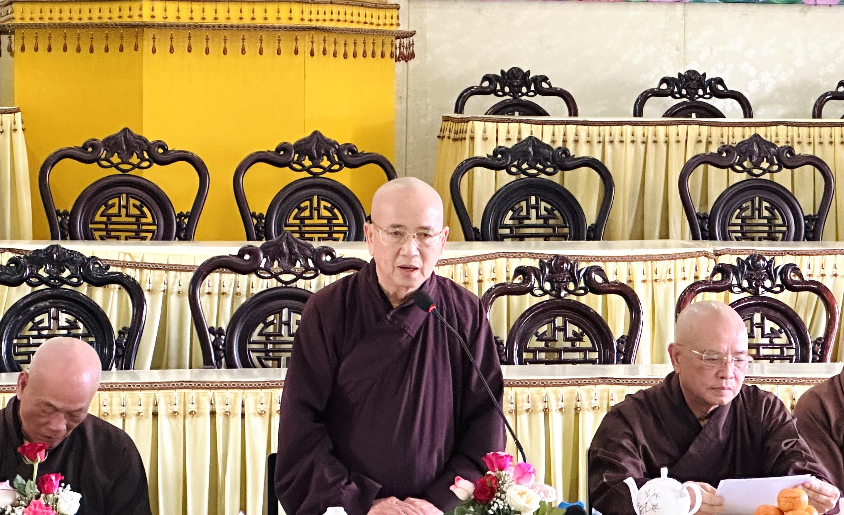 | Hoà thượng Thích Khế Chơn - Trưởng ban Trị sự Giáo hội Phật giáo Việt Nam tỉnh Thừa Thiên Huế phát biểu tại Hội nghị. |