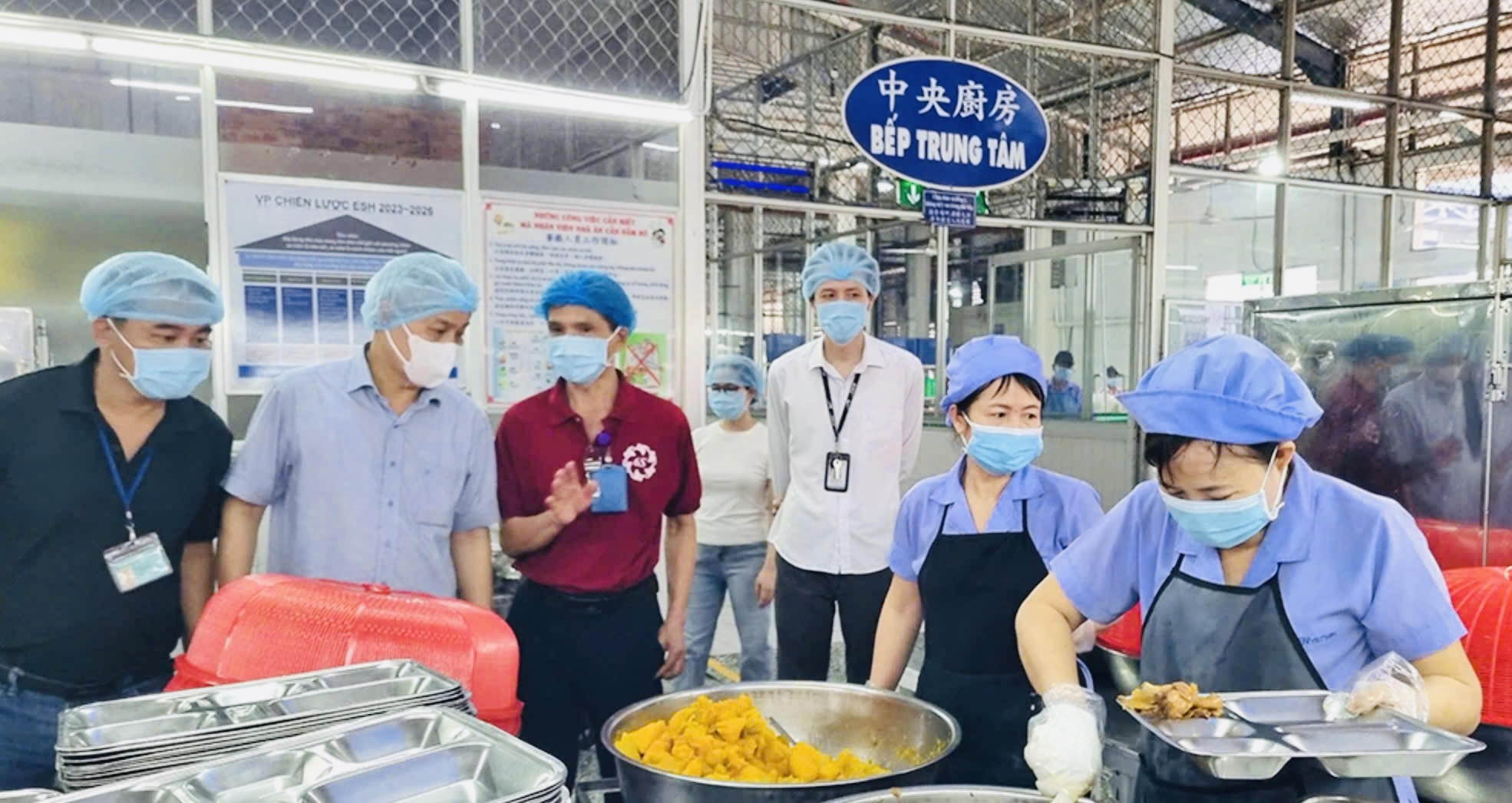 Đoàn công tác kiểm tra khu vực bếp ăn của Công ty TNHH Pouchen Việt Nam. |