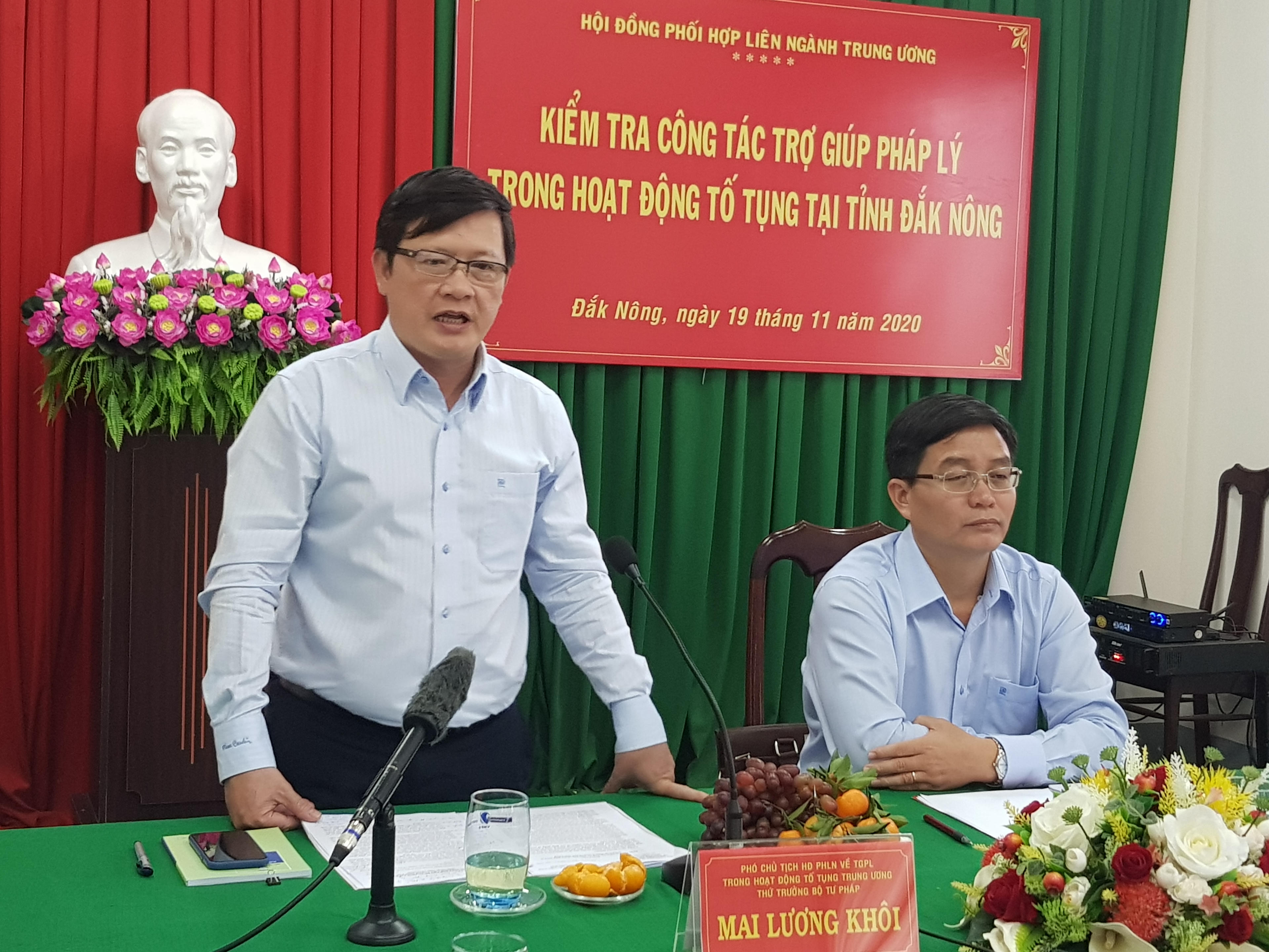 Thứ trưởng Mai Lương Khôi cũng yêu cầu: Sở Tư pháp và Trung tâm TGPL tỉnh Đắk Nông cần chủ động hơn nữa, làm sao để đối tượng TGPL tiếp cận, hiểu và nâng cao nhận thức về TGPL. Cần hỗ trợ, hướng dẫn và trợ giúp đối tượng TGPL bảo vệ quyền và lợi ích hợp pháp của người được TGPL. Địa phương cũng cần xác định rõ nguồn lực và năng lực của Trợ giúp viên TGPL. Từ những thực trạng tồn tại mới đưa ra được các giải pháp hiệu quả về công tác TGPL.