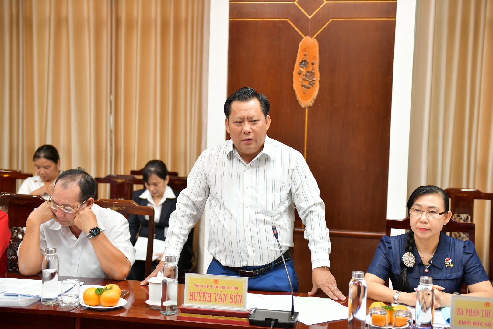 Tiếp và làm việc với Đoàn kiểm tra có đồng chí Huỳnh Văn Sơn - Phó Chủ tịch UBND tỉnh Long An cùng đại diện Lãnh đạo các sở, ngành (Văn phòng UBND tỉnh, Sở Tư pháp, Tòa án nhân dân (TAND) tỉnh, VKSND tỉnh, cơ quan Công an tỉnh, Cục Thi hành án dân sự (THADS) tỉnh, Sở Tài chính, Thanh tra tỉnh, Sở Nội vụ) và các cơ quan có phát sinh vụ việc yêu cầu bồi thường trên địa bàn tỉnh Long An. Đồng thời, tham dự buổi kiểm tra còn có đại diện của Ban Nội chính tỉnh ủy Long An.