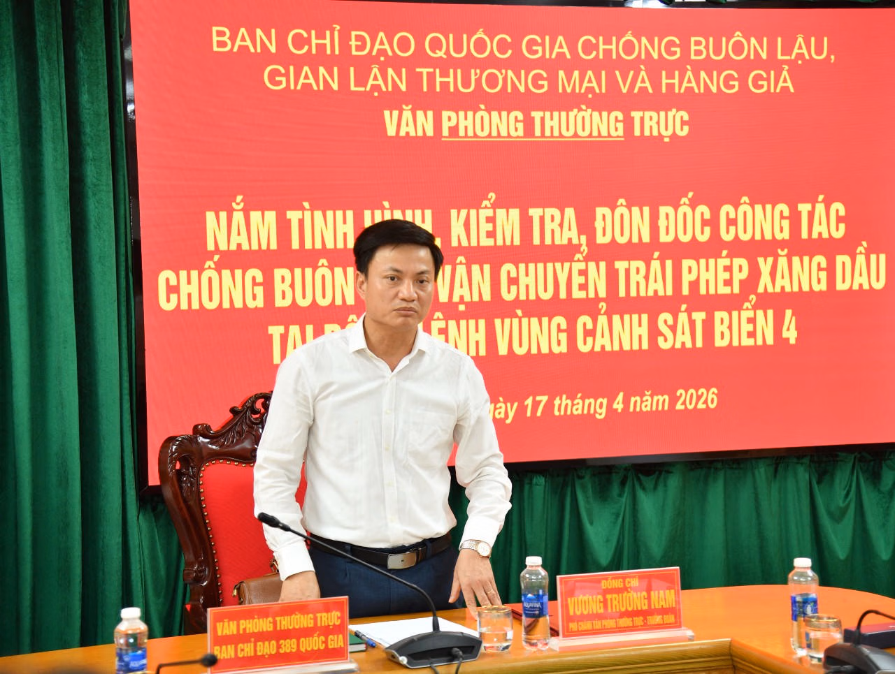 Chiều 17/4, tại Đặc khu Phú Quốc, tỉnh An Giang, Đoàn Công tác của Văn phòng Thường trực Ban Chỉ đạo Quốc gia chống buôn lậu, gian lận thương mại và hàng giả (Ban Chỉ đạo 389 Quốc gia) đã đến nắm tình hình, kiểm tra công tác chống buôn lậu, kinh doanh, vận chuyển trái phép xăng dầu trên địa bàn vùng biển do BTL Vùng Cảnh sát biển 4 quản lý.