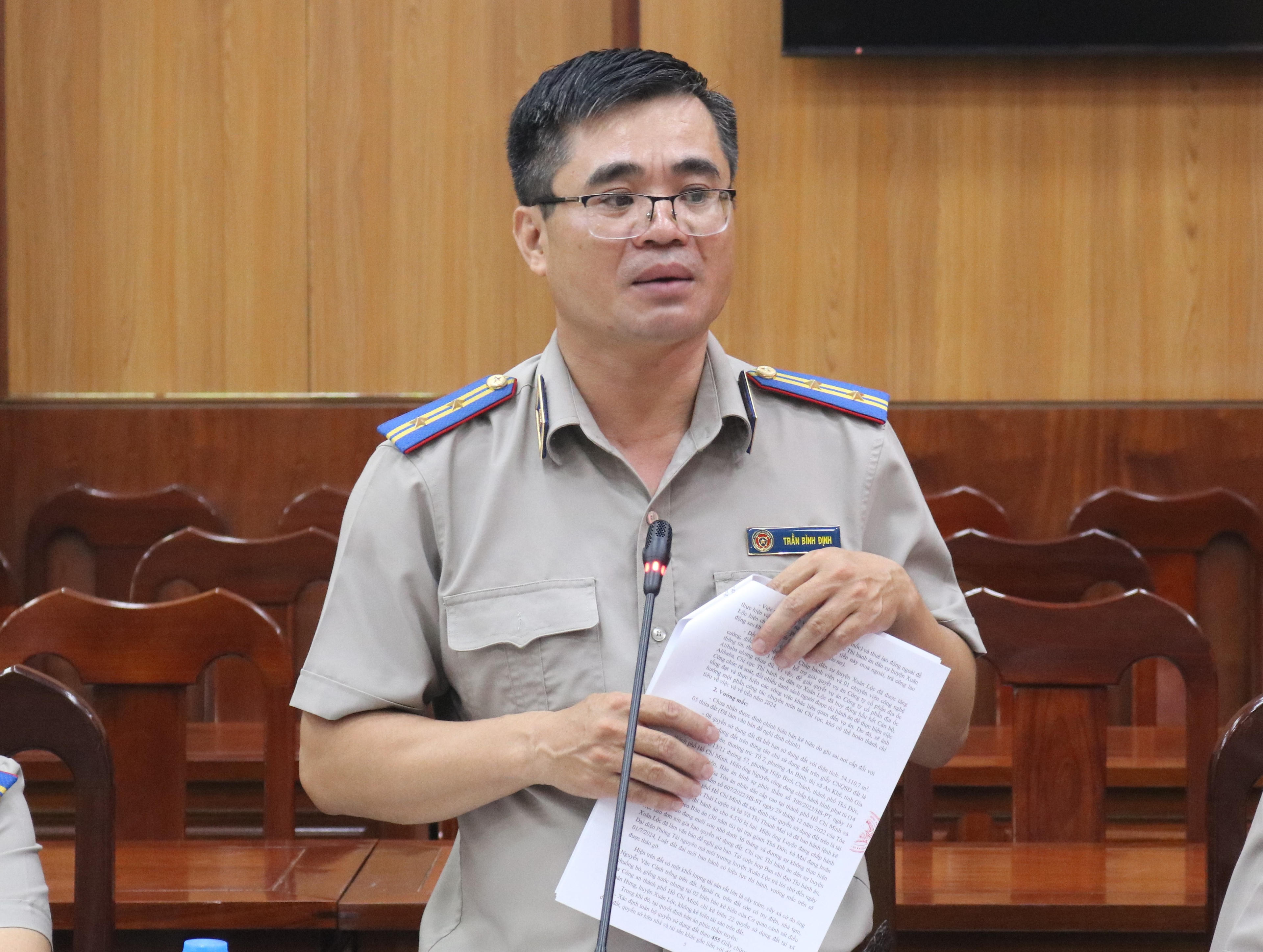 Ông Trần Bình Định – Chi Cục trưởng Cục THADS huyện Xuân Lộc trình bày các khó khăn, vướng mắc trong công tác thi hành án như: tạm ứng cưỡng chế chưa được cấp, 8/22 thửa đất hết hạn trong khi chủ đất đang ngồi tù, số lượng mốc ngoài thực địa quá lớn (196 mốc), nhân sự của Cục còn thiếu.