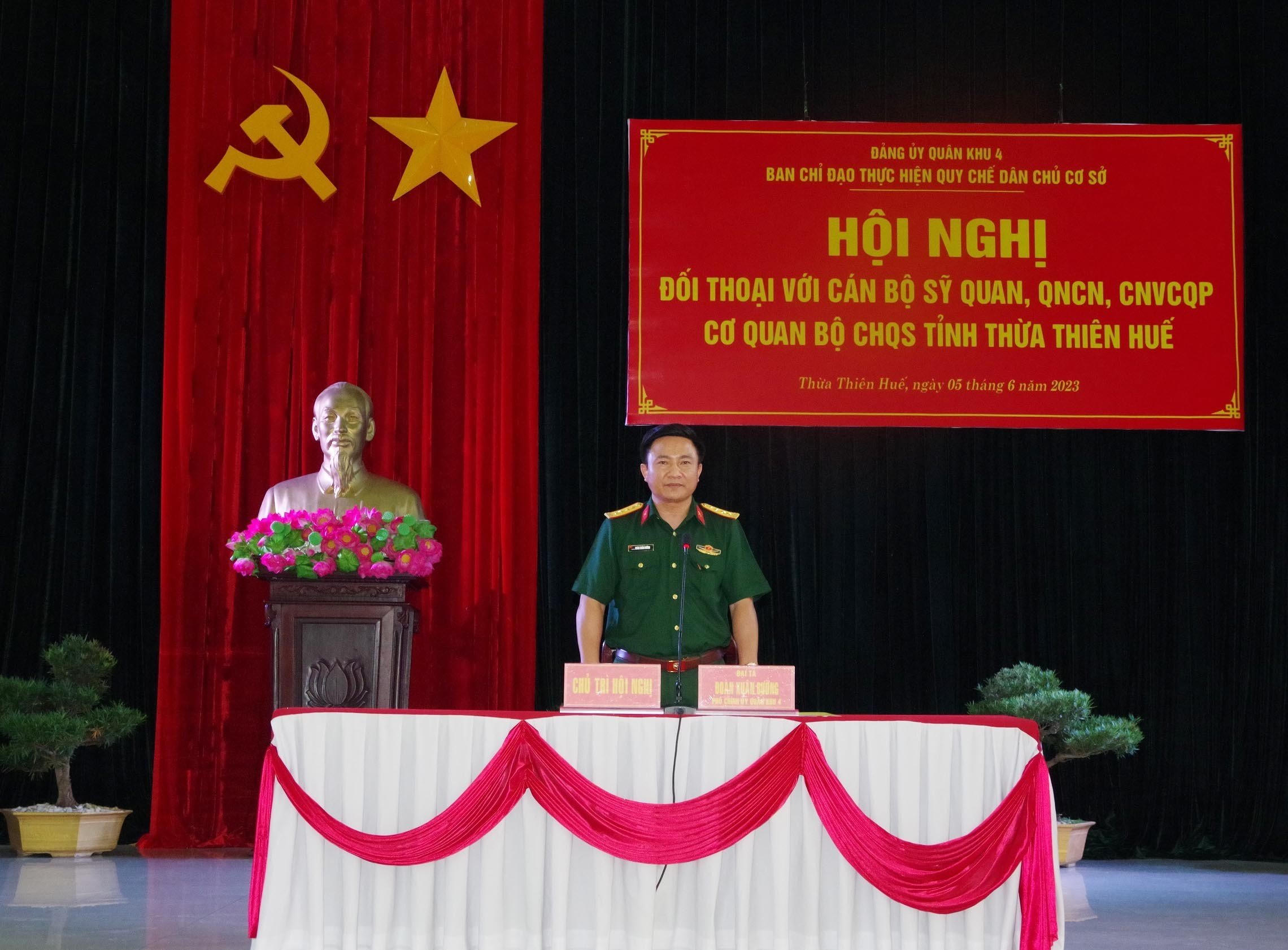 Đại tá Đoàn Xuân Bường, Phó Chính ủy Quân khu chủ trì buổi đối thoại dân chủ với cán bộ sĩ quan, quân nhân chuyên nghiệp. |
