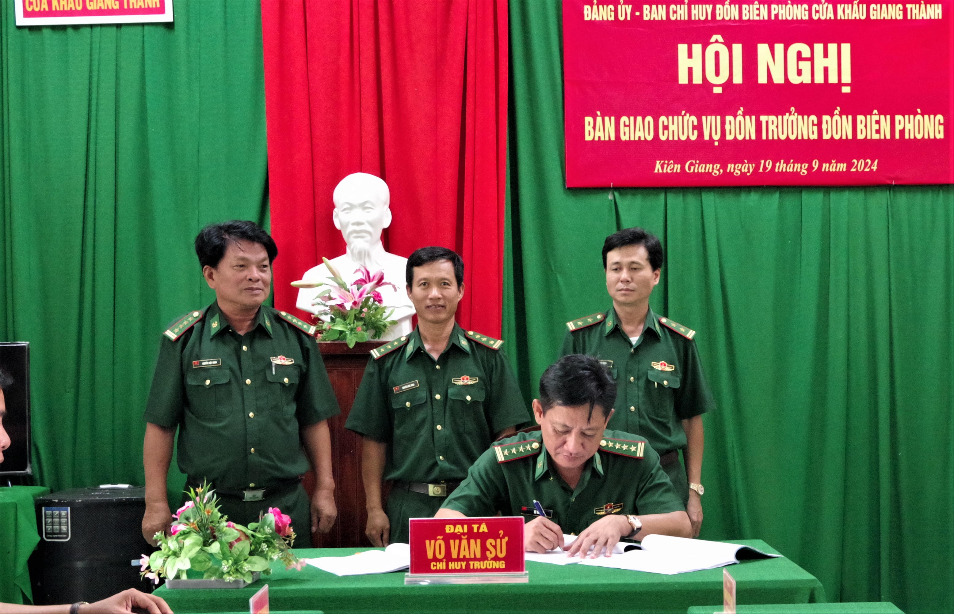 Đại tá Võ Văn Sử, Tỉnh ủy viên, Chỉ huy trưởng Bộ đội Biên phòng, ký xác nhận biên bản bàn giao chức trách đồn trưởng. |