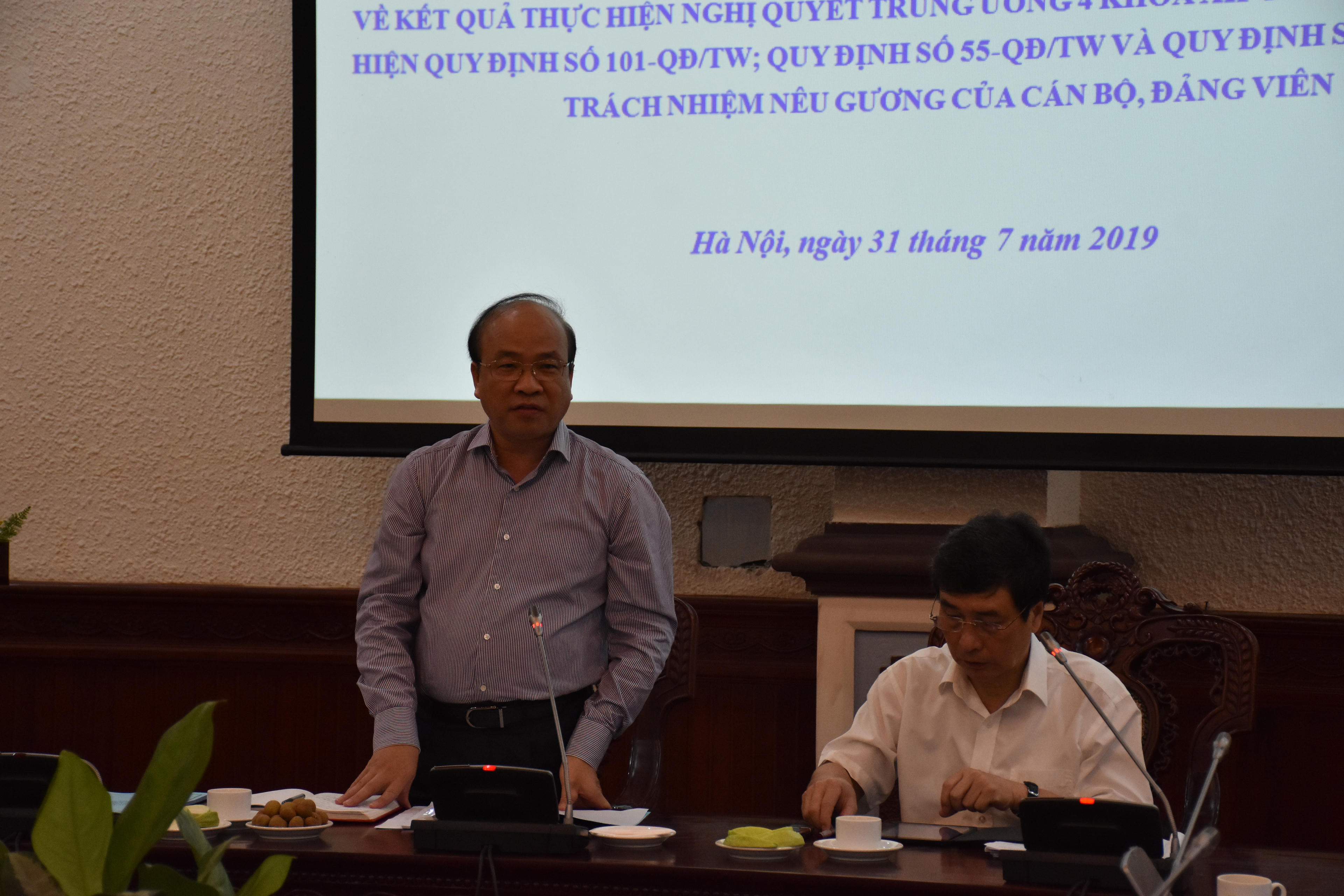 Cuộc làm việc về kết quả thực hiện Nghị quyết Trung ương 4 khóa XII gắn với việc thực hiện Quy định số 101-QĐ/TW, Quy định số 55-QĐ/TW và Quy định số 08-QĐ/TW về trách nhiệm nêu gương của cán bộ, đảng viên. Đồng chí Trần Việt Hùng, Phó Chánh Văn phòng Trung ương Đảng, Phó Trưởng đoàn công tác chủ trì buổi làm việc. Làm việc với đoàn, về phía Bộ Tư pháp có Bí thư Đảng ủy Bộ, Thứ trưởng Bộ Tư pháp Phan Chí Hiếu; Phó Bí thư thường trực Đảng ủy Bộ Nguyễn Kim Tinh.