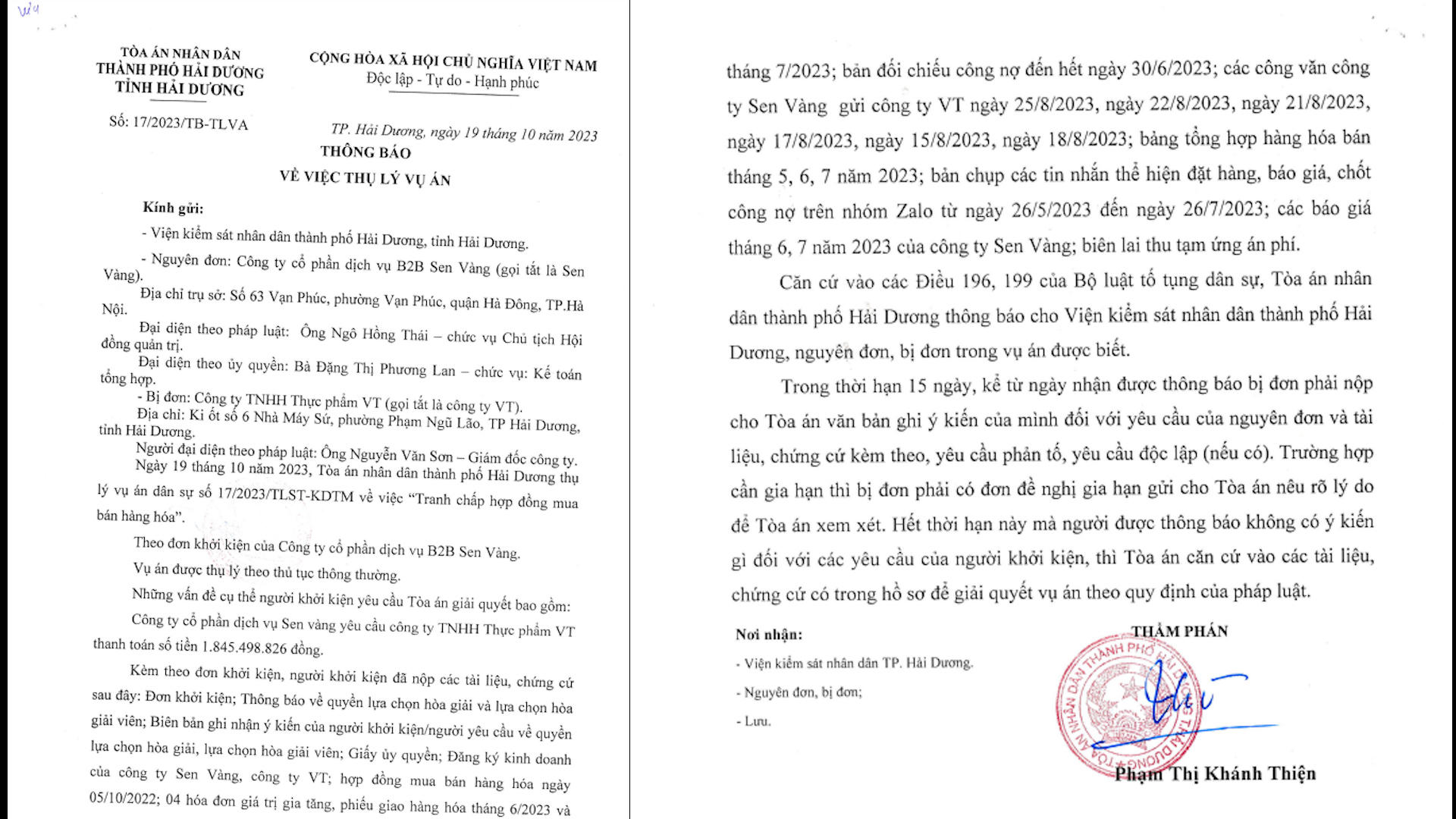 (PLM) - Từ đối tác hợp tác kinh doanh dài lâu ổn định, nhưng quá trình hợp tác nảy sinh bất đồng trong giải quyết các khoản nợ giữa hai doanh nghiệp, Công ty cổ phần dịch vụ B2B Sen Vàng (công ty Sen Vàng) đã quyết định khởi kiện công ty TNHH thực phẩm VT (Công ty VT).