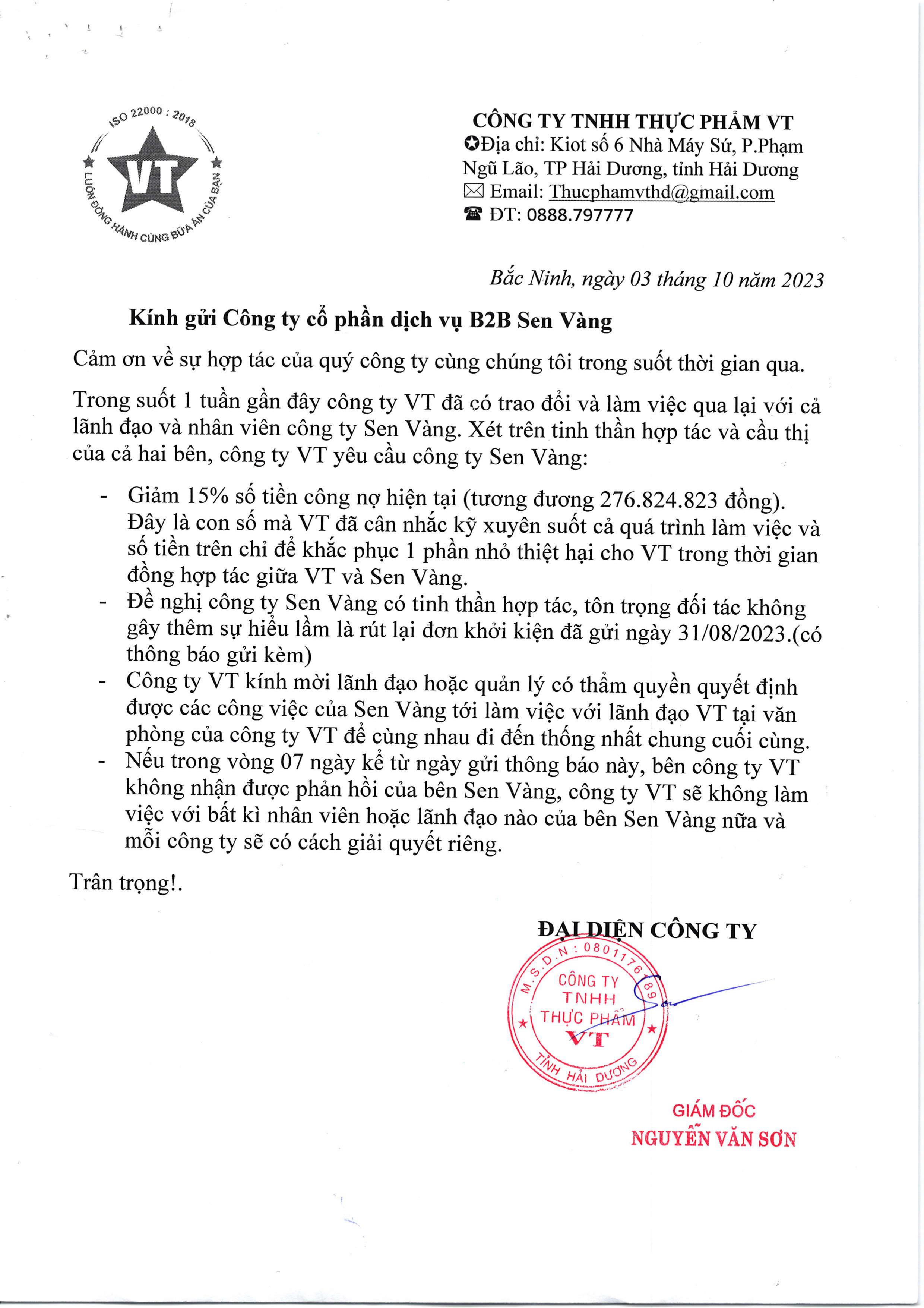 Văn bản công ty VT gửi công ty Sen Vàng ngày 3/10/2023 |