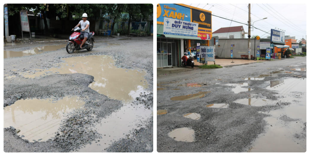 Ghi nhận của PV tại hiện trường, nhiều điểm mặt đường bị khoét sâu, rộng cả mét vuông, có chỗ ổ gà chiếm hơn nửa mặt đường, khiến cho việc di chuyển qua lại của người dân rất khó khăn.
