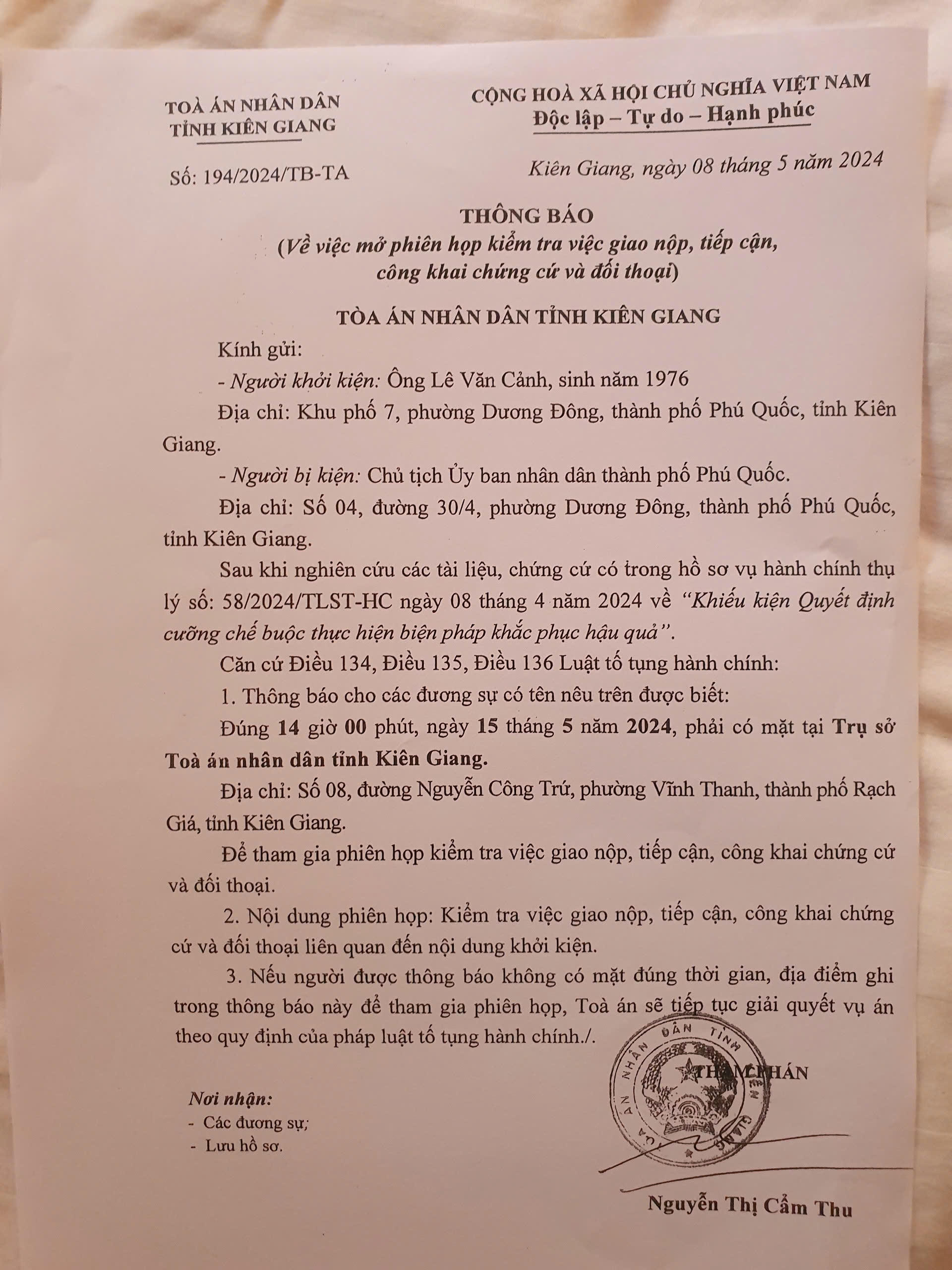 Thông báo về việc mở phiên họp kiểm tra, giao nộp tài liệu công khai chứng cứ và đối thoại của TAND tỉnh Kiên Giang giữa người khởi kiện là ông Lê Văn Cảnh người bị kiện là Chủ tịch UBND TP Phú Quốc. |