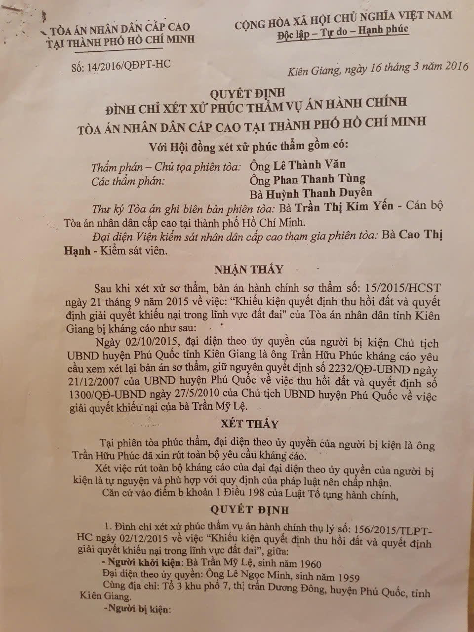 Quyết định đình chỉ xét xử phúc thẩm vụ án hành chính của tòa án nhân dân cấp cao tại TP. Hồ Chí Minh |