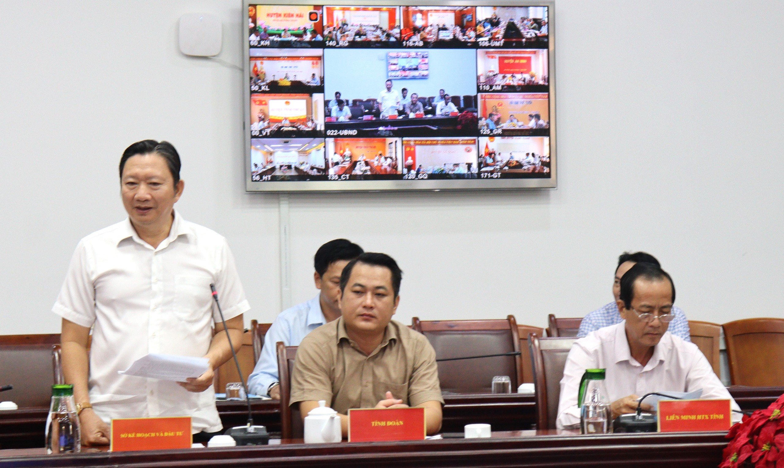Phó Giám đốc Sở Kế hoạch và Đầu tư tỉnh Kiên Giang Huỳnh Xuân Vũ báo cáo tình hình thực hiện Chương trình MTQG tại cuộc họp. |
