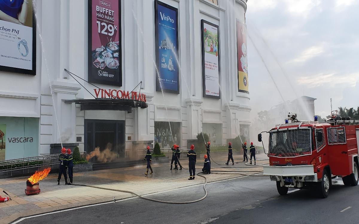 Theo tình huống giả định, vào lúc 7h sáng 30/6, tại tầng 2 siêu thị VinMart thuộc Trung tâm thương mại Vincom Plaza bị một số đối tượng khủng bố đặt bom xăng gây nổ rồi phát cháy, đám cháy lan nhanh với diện tích trên 100m2.