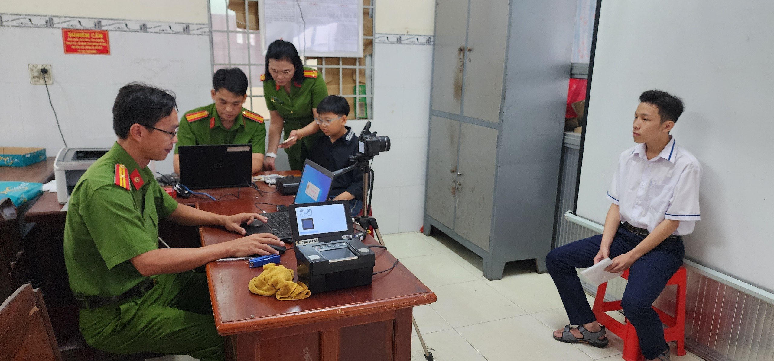 Cán bộ Phòng Cảnh sát Quản lý Hành chính về Trật tự xã hội - Công an Công an tỉnh Kiên Giang cấp thẻ căn cước cho trẻ em. |