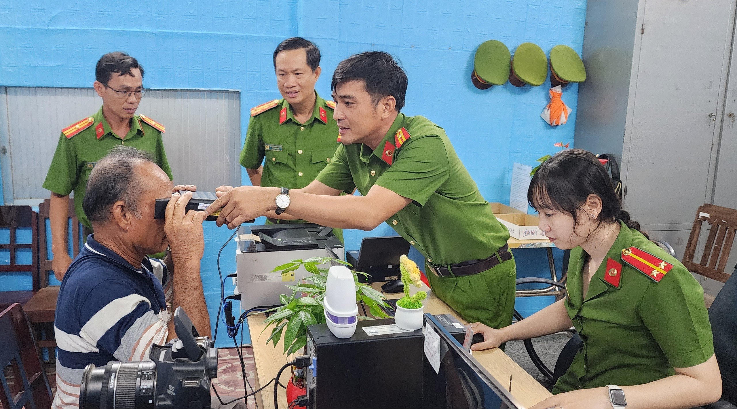 Cán bộ Công an huyện Châu Thành tiến hành thu sinh trắc học mống mắt cho người dân. |