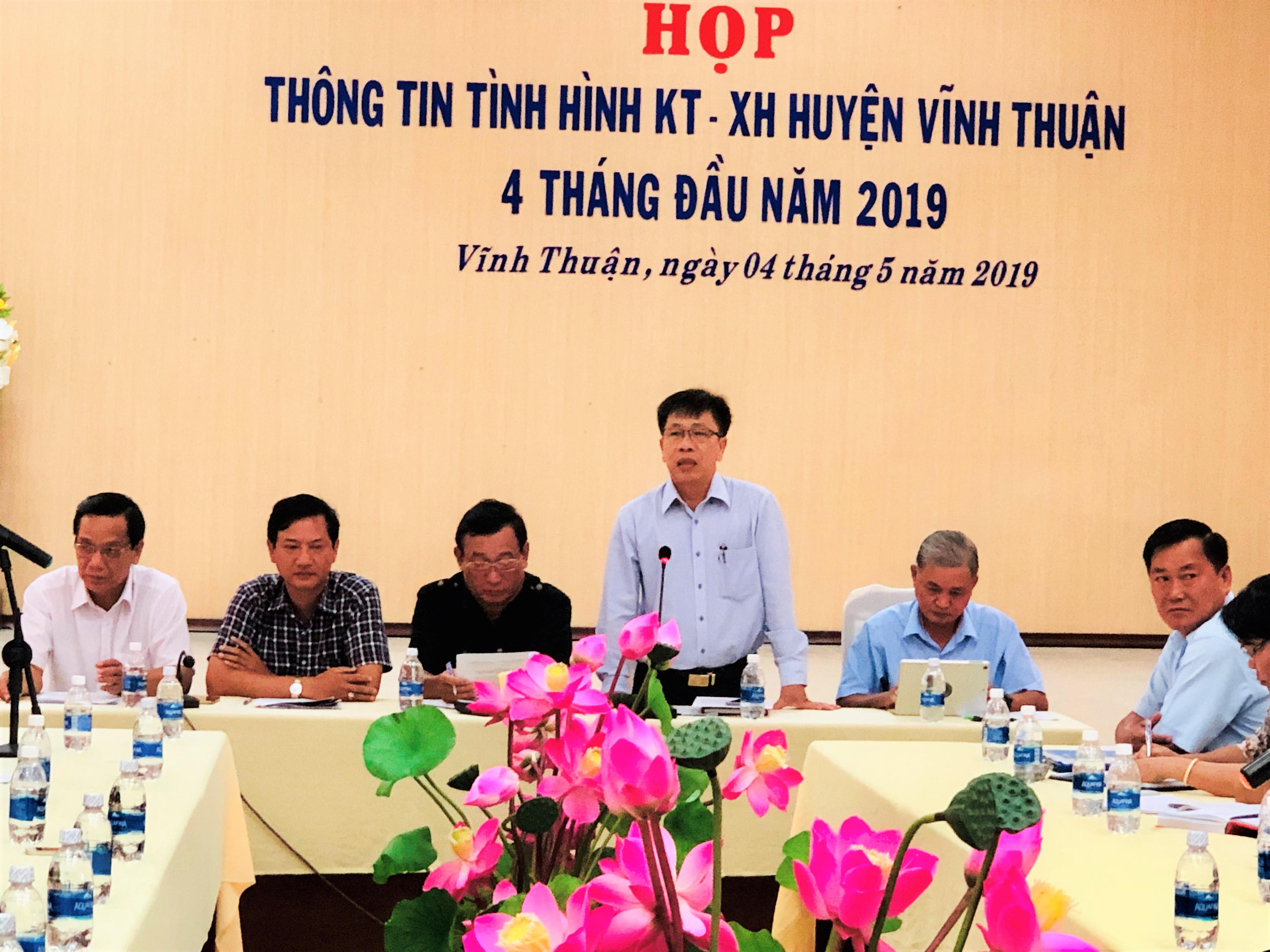 Xác định nông nghiệp là thế mạnh, đến nay, Vĩnh Thuận đã thực hiện sản xuất ba cánh đồng mẫu lớn, có liên kết bao tiêu sản phẩm với doanh nghiệp. Nhiều mô hình mới như nuôi cua thương phẩm, nuôi tôm càng xanh xen tôm sú, nuôi tôm - lúa cộng đồng, trồng rau màu… thực hiện rất hiệu quả. Tổng giá trị sản xuất (giá so sánh 2010) 4.985 tỷ đồng, tăng 1,88% so với năm 2018. Tỷ lệ hộ nghèo giảm từ 1-1,5%. Huy động học sinh 6-14 tuổi đến trường đạt 99,3%, trẻ 3-5 tuổi đến trường đạt 62%. Giải quyết việc làm cho 3.500 lao động trở lên; tỷ lệ lao động qua đào tạo 66,3%. Tỷ lệ dân số tham gia bảo hiểm y tế 87% trở lên. Trong 4 tháng đầu năm 2019, tình hình KT-XH của huyện đã đạt kết quả tích cực.