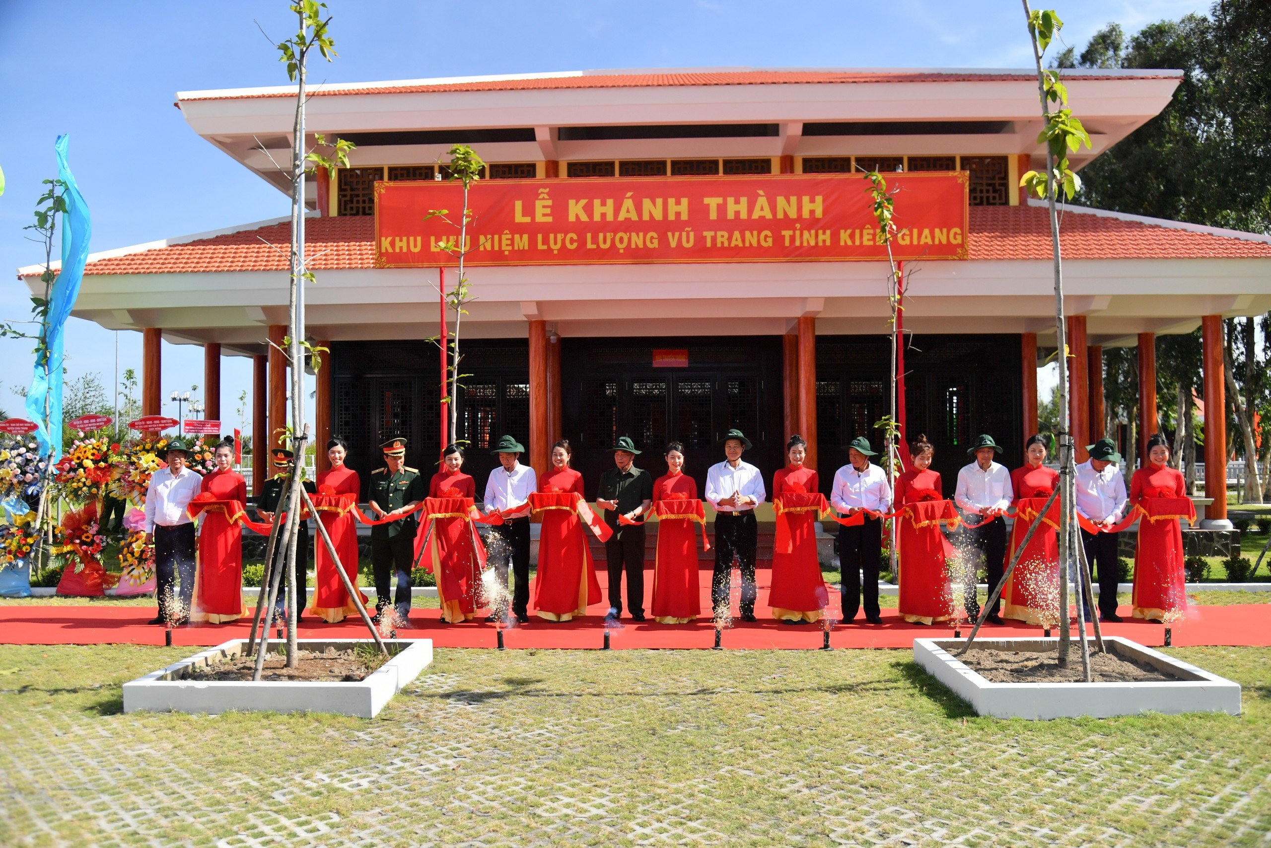 Các đồng chí nguyên lãnh đạo Đảng, Nhà nước, Quân khu 9 và tỉnh Kiên Giang cắt băng khánh thành Khu lưu niệm lực lượng vũ trang tỉnh Kiên Giang. |