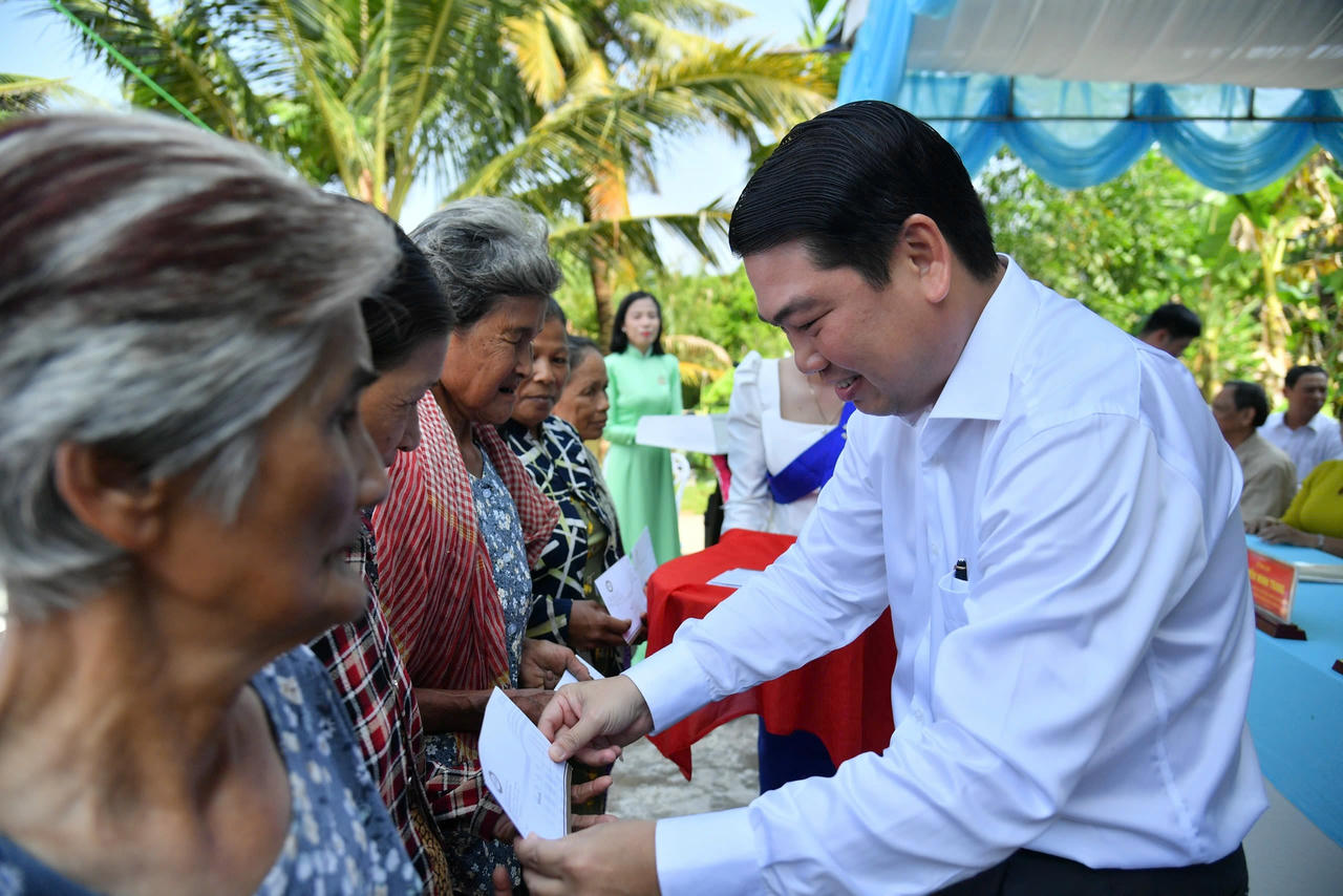 Phó Chủ tịch UBND tỉnh Lê Trung Hồ trao tiền hỗ trợ cho người dân tại ấp Tà Yểm, xã Bàn Thạch, huyện Giồng Riềng. |