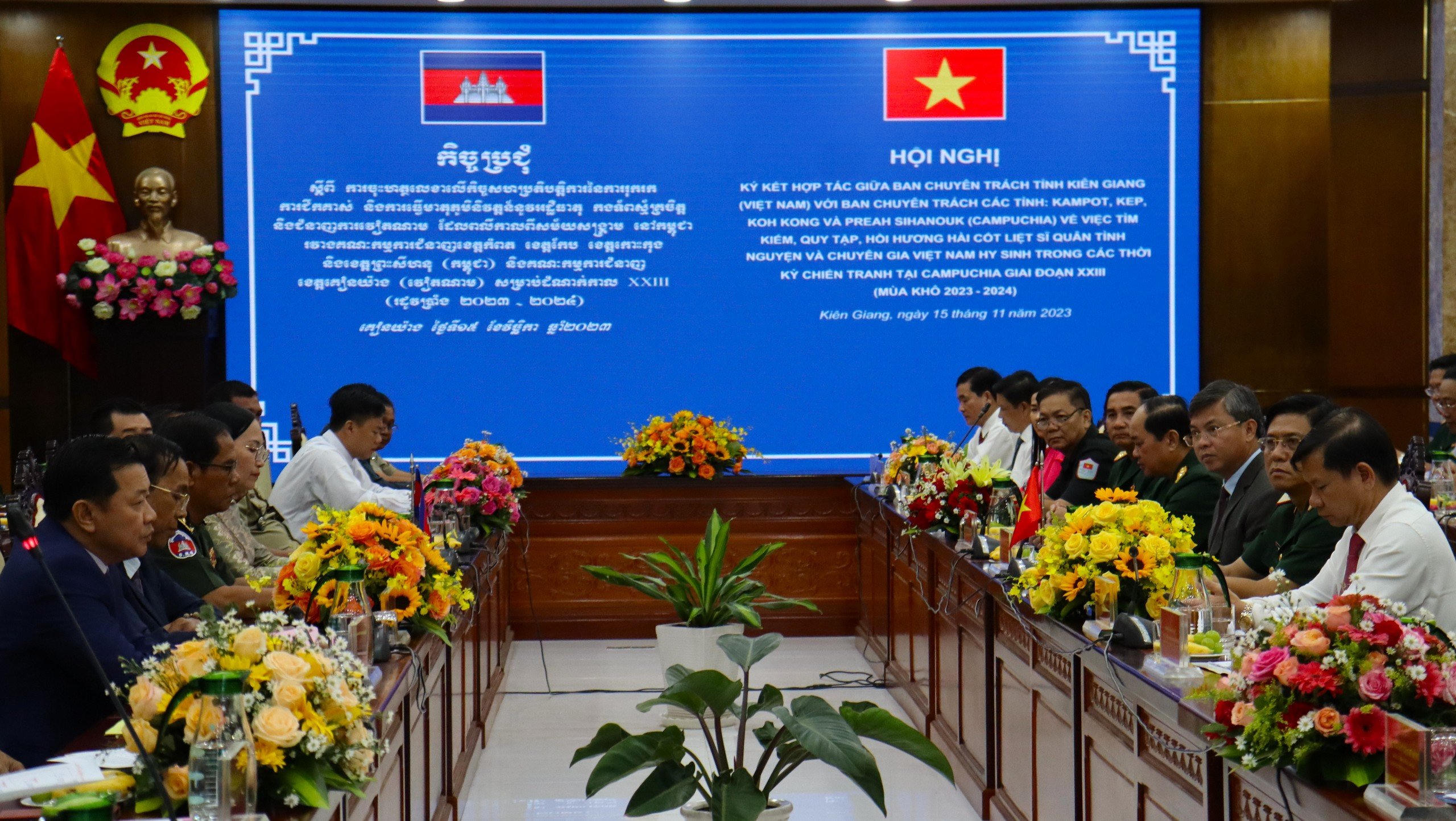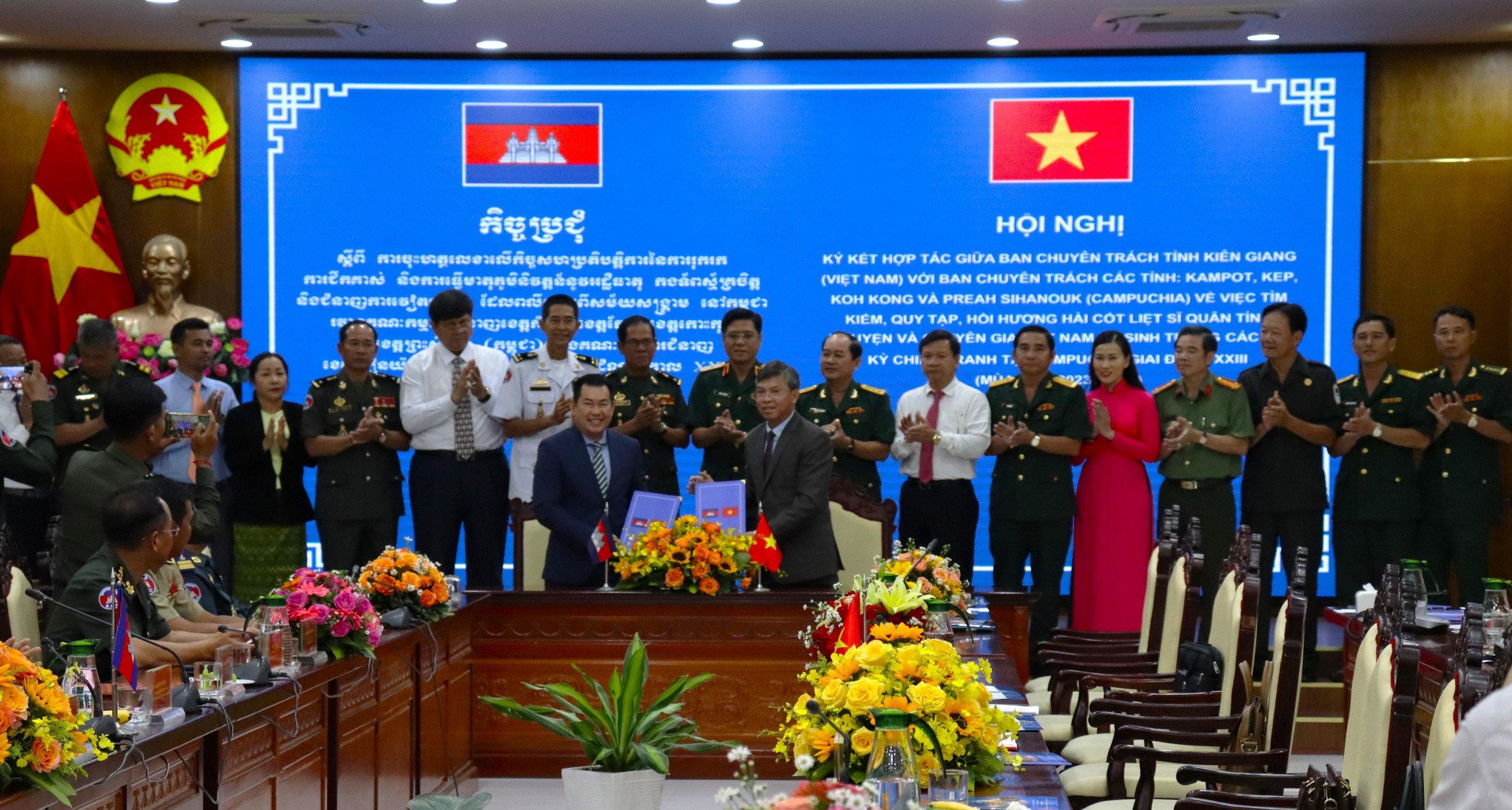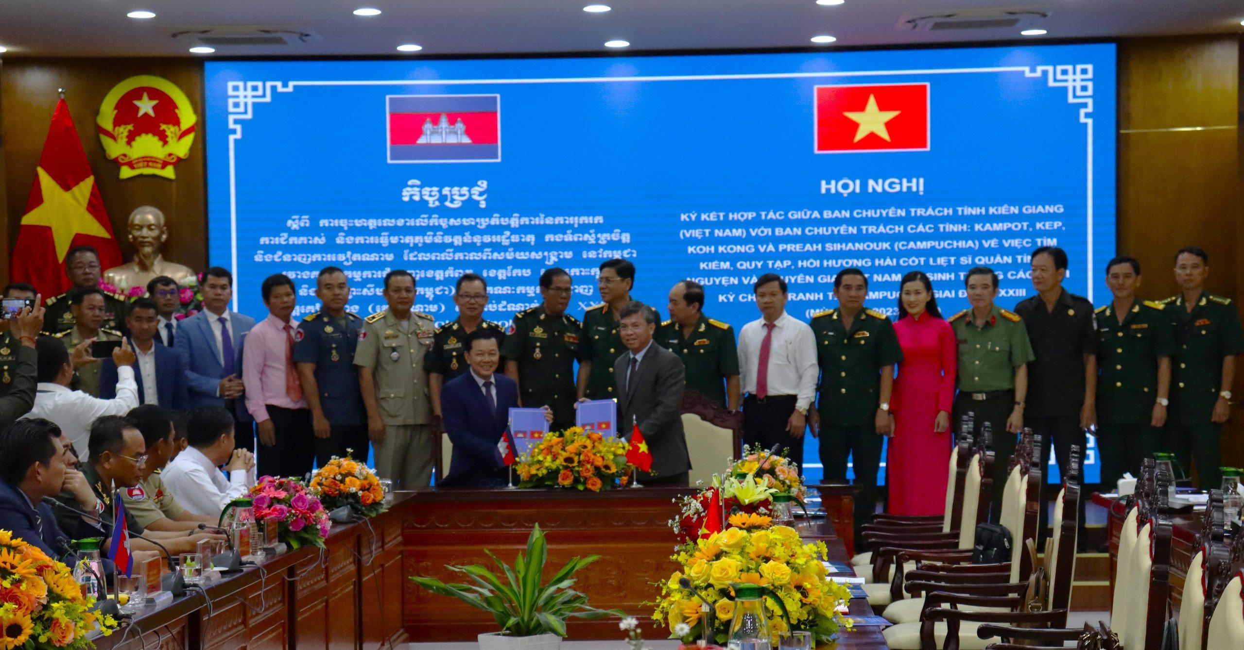 (PLVN) - UBND tỉnh Kiên Giang mới tổ chức Lễ ký kết hợp tác tìm kiếm, quy tập, hồi hương hài cốt liệt sĩ quân tình nguyện và chuyên gia Việt Nam hy sinh trong các thời kỳ chiến tranh tại Campuchia giữa tỉnh Kiên Giang với các tỉnh: Koh Kong, PreahSihanouk, Kam Pốt, Kép thuộc Vương quốc Campuchia, giai đoạn XXIII (mùa khô 2023 - 2024).
