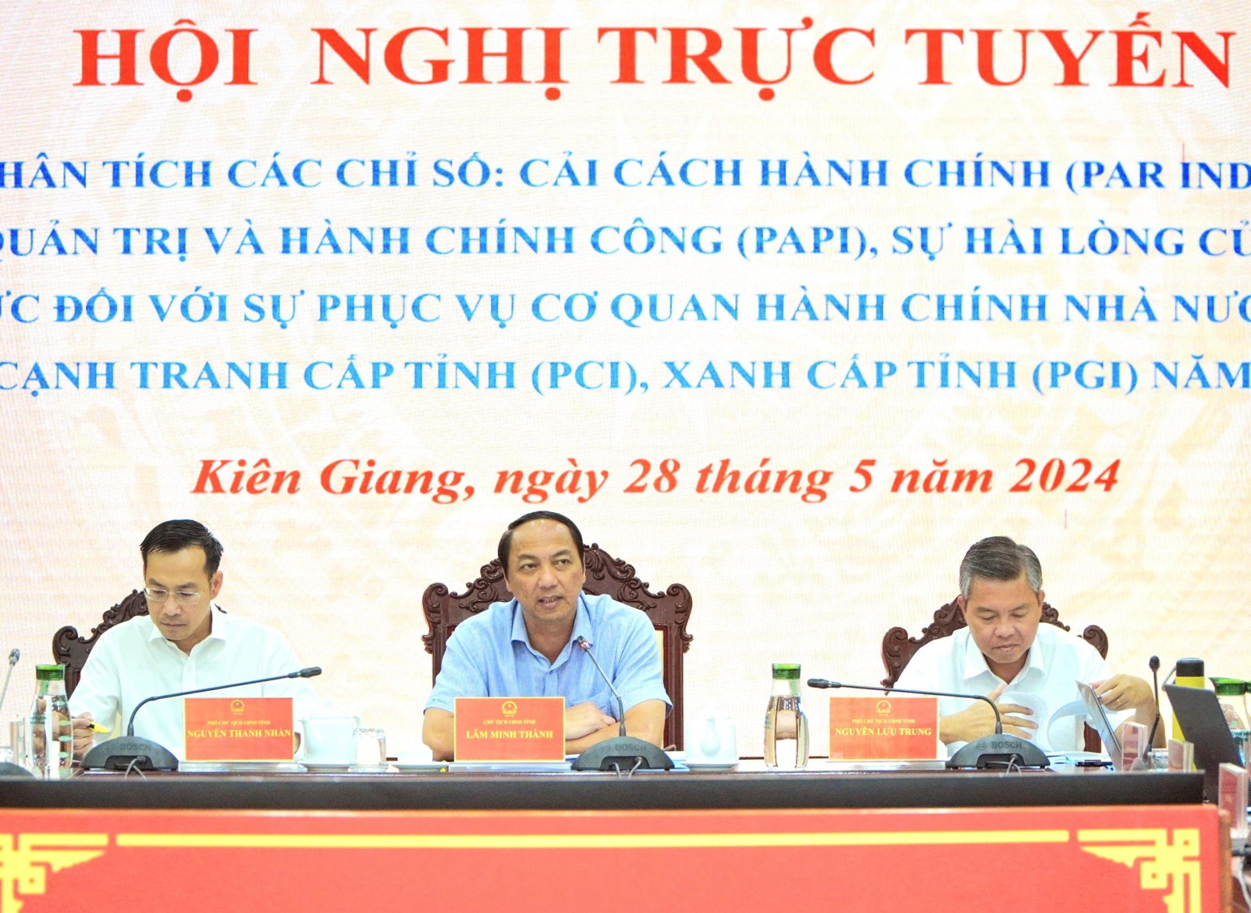 (PLVN) - Ngày 28/5, UBND tỉnh Kiên Giang tổ chức hội nghị trực tuyến phân tích các chỉ số cải cách hành chính (PAR INDEX); Hiệu quả quản trị và hành chính công (PAPI); sự hài lòng của người dân, tổ chức đối với sự phục vụ cơ quan hành chính nhà nước (SIPAS); Năng lực cạnh tranh cấp tỉnh (PCI) và chỉ số xanh cấp tỉnh (PGI) năm 2023.