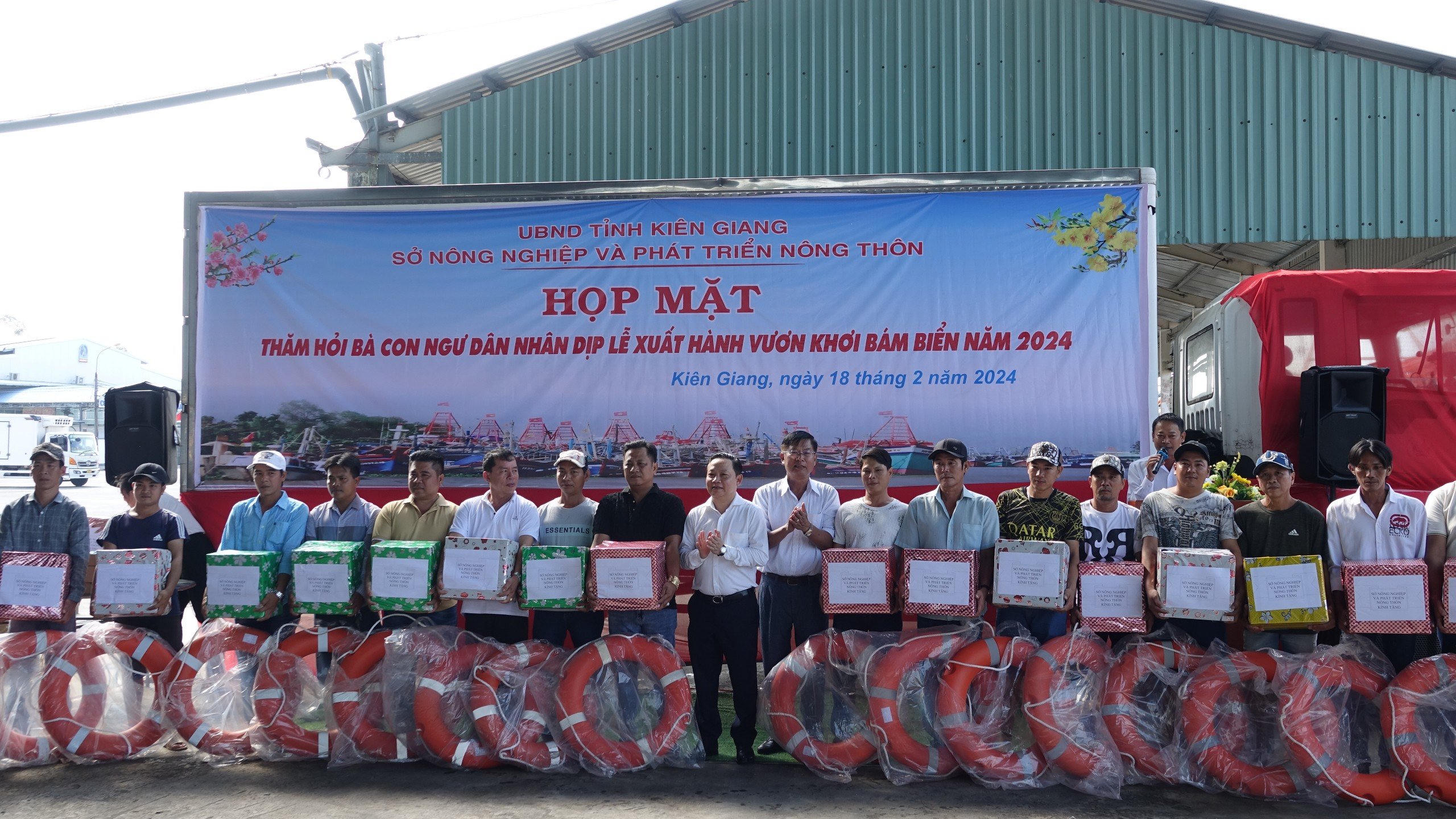 Sở Nông nghiệp và phát triển nông thôn tỉnh Kiên Giang tặng quà cho ngư dân nhân dịp xuất hành vươn khơi bám biển. |