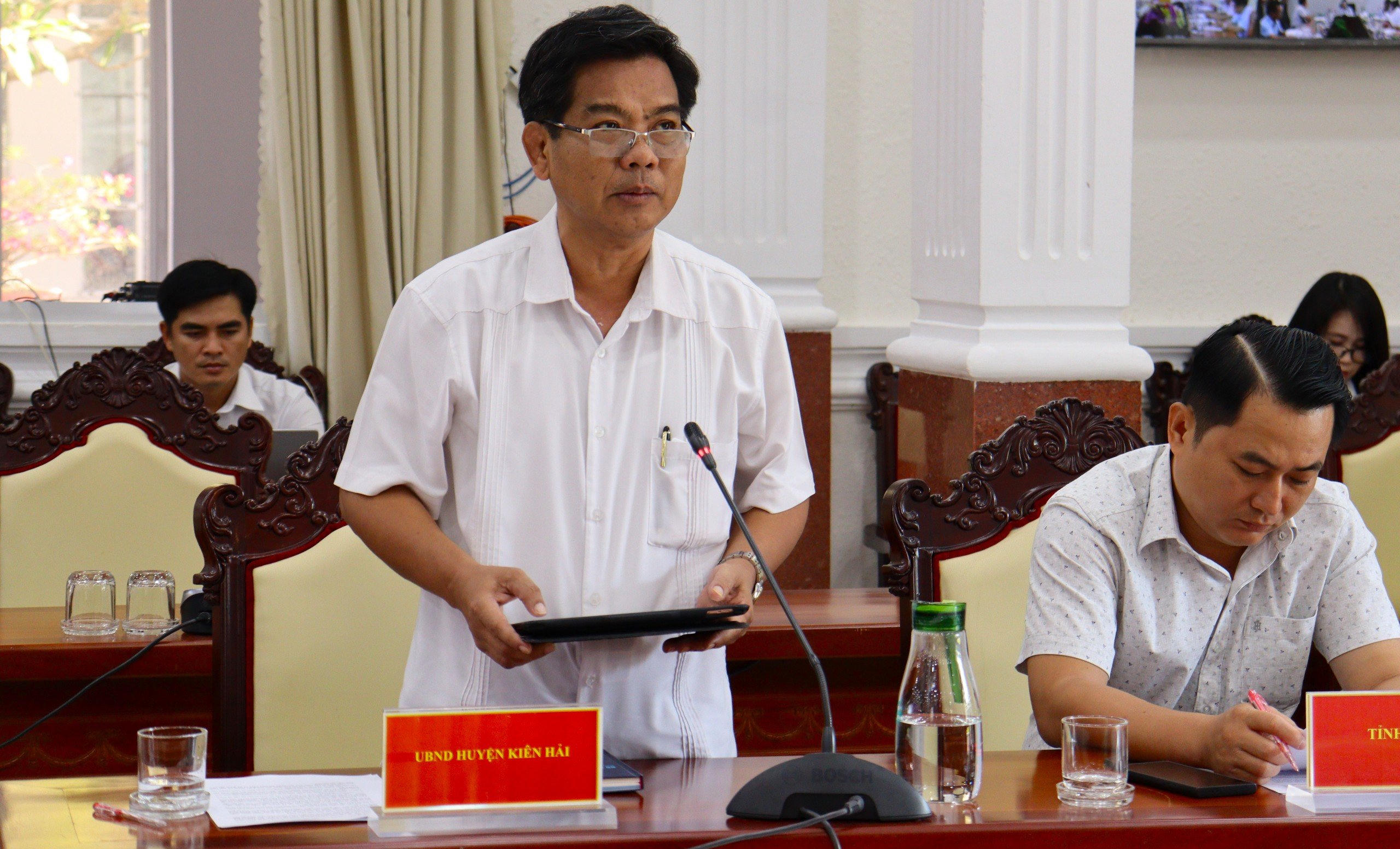 Ông Nguyễn Quốc Tuấn - Chủ tịch UBND huyện Kiên Hải báo cáo tình hình triển khai các Chương trình mục tiêu quốc gia tại huyện Kiên Hải. |