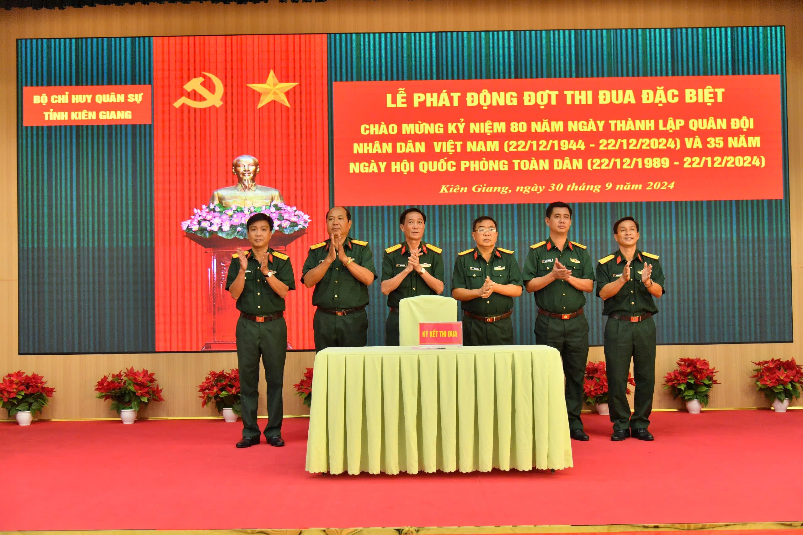 (PLVN) - Ngày 30/9/2024 Bộ CHQS tỉnh Kiên Giang phát động đợt thi đua đặc biệt chào mừng kỷ niệm 80 năm Ngày thành lập Quân đội nhân dân Việt Nam (22/12/1944 - 22/12/2024) và 35 năm Ngày hội Quốc phòng toàn dân (22/12/1989 - 22/12/2024). Đại tá Cao Minh Tâm - Phó Chính ủy Bộ CHQS tỉnh chủ trì buổi lễ.