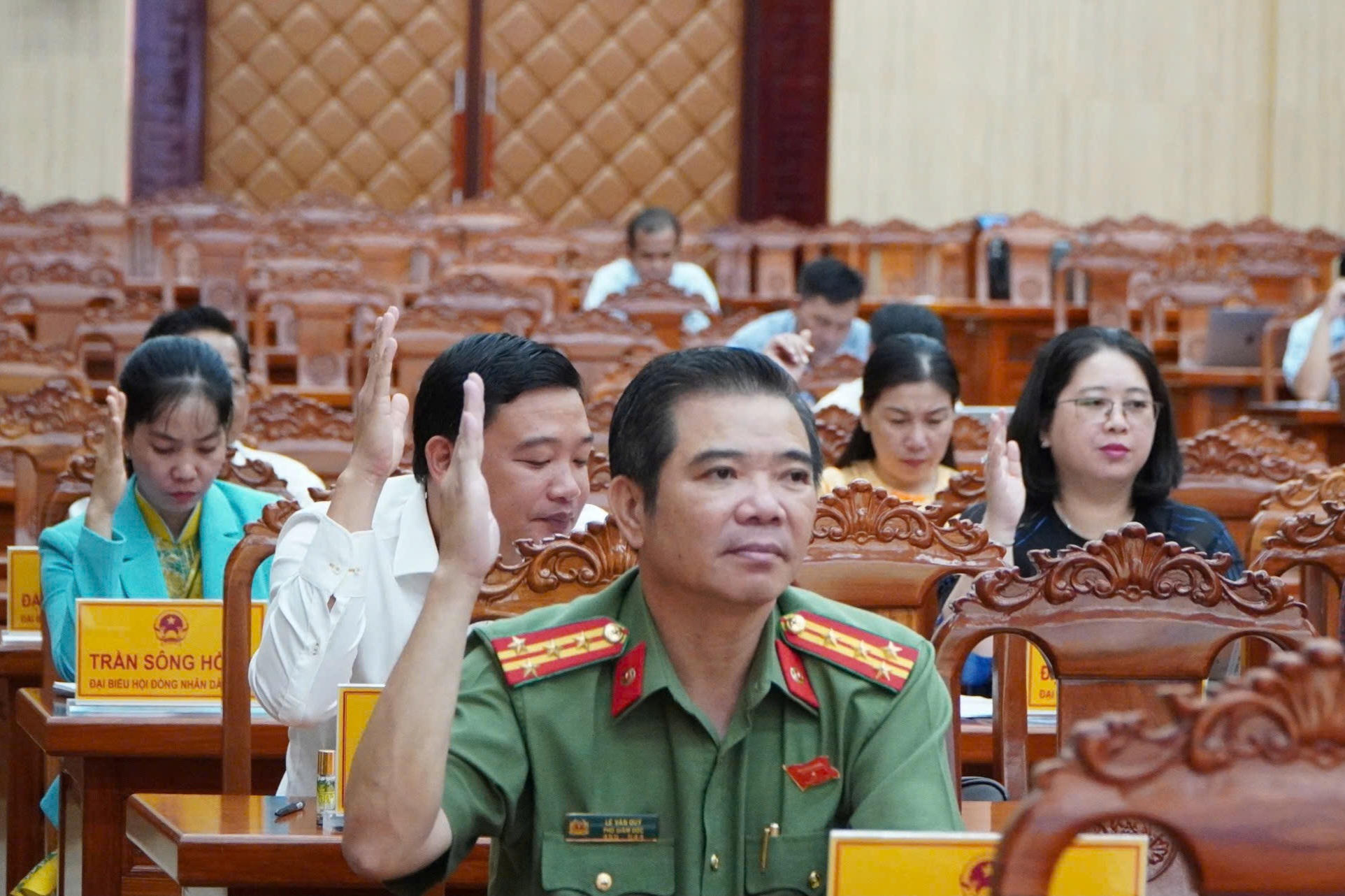 Các đại biểu HĐND tỉnh Kiên Giang biểu quyết thông qua các dự thảo Nghị quyết. |