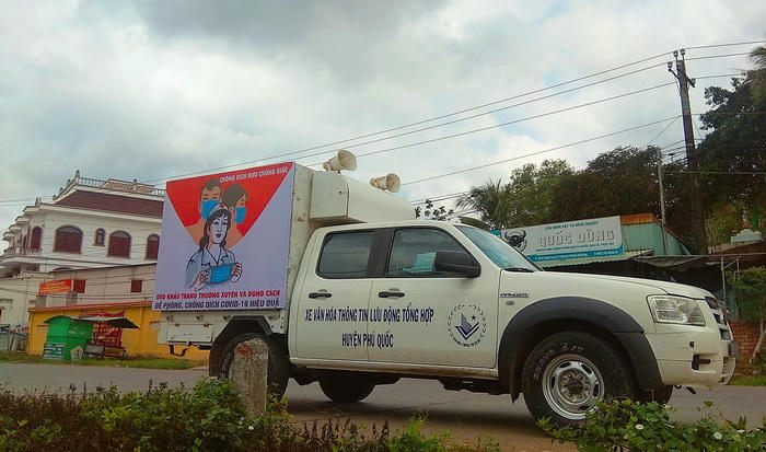 Chị Nguyễn Ngọc Tuyết - Phó Giám đốc Trung tâm Văn hóa, Thể thao và Du lịch huyện Phú Quốc cho biết: Trung tâm đã xây dựng thông điệp truyền thông bằng pano, cờ phướn treo trên các trục đường chính trên địa bàn huyện còn xe tuyên truyền lưu động đi cổ động phát thanh đến tận các xã, thị trấn trong huyện, tập trung cao điểm trong tháng 3 và tháng 4/2020. Ngoài ra, Trung tâm còn thu âm các khẩu hiệu tuyên truyền, công văn theo khuyến cáo của Trung ương và địa phương để chuyển cho các xã phát trên đài truyền thanh cơ sở.