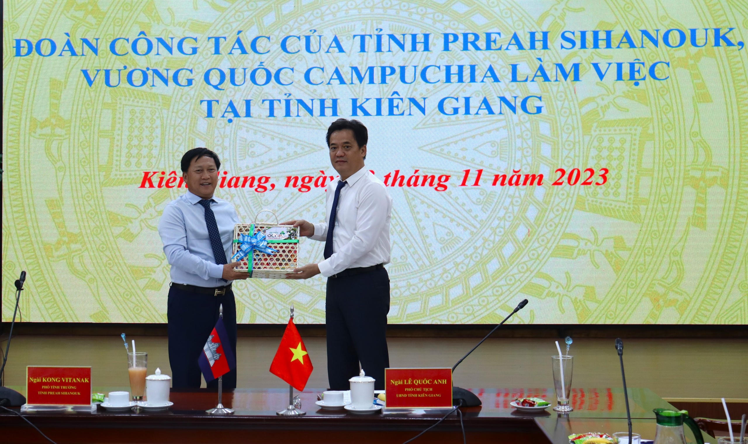 Dịp này, Phó Chủ tịch UBND tỉnh Kiên Giang Lê Quốc Anh trao tặng Ngài Kong Vitanak - Phó Tỉnh trưởng tỉnh Preah Sihanouk sản phẩm OCOP trên địa bàn tỉnh Kiên Giang.