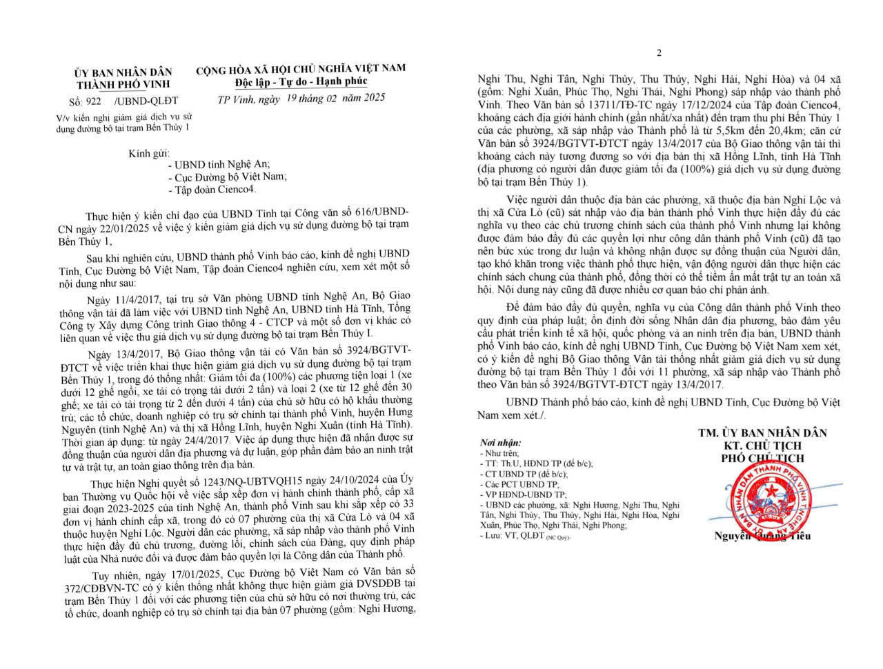 Chính vì thế, để đảm bảo đầy đủ quyền, nghĩa vụ của công dân thành phố Vinh theo quy định của pháp luật, ổn định đời sống nhân dân địa phương, bảo đảm yêu cầu phát triển kinh tế - xã hội, quốc phòng và an ninh trên địa bàn, UBND thành phố Vinh kiến nghị UBND tỉnh Nghệ An, Cục Đường bộ Việt Nam xem xét, có ý kiến đề nghị Bộ Giao thông vận tải thống nhất giảm giá dịch vụ sử dụng đường bộ tại trạm Bến Thủy 1 đối với 11 phường, xã sáp nhập vào thành phố.