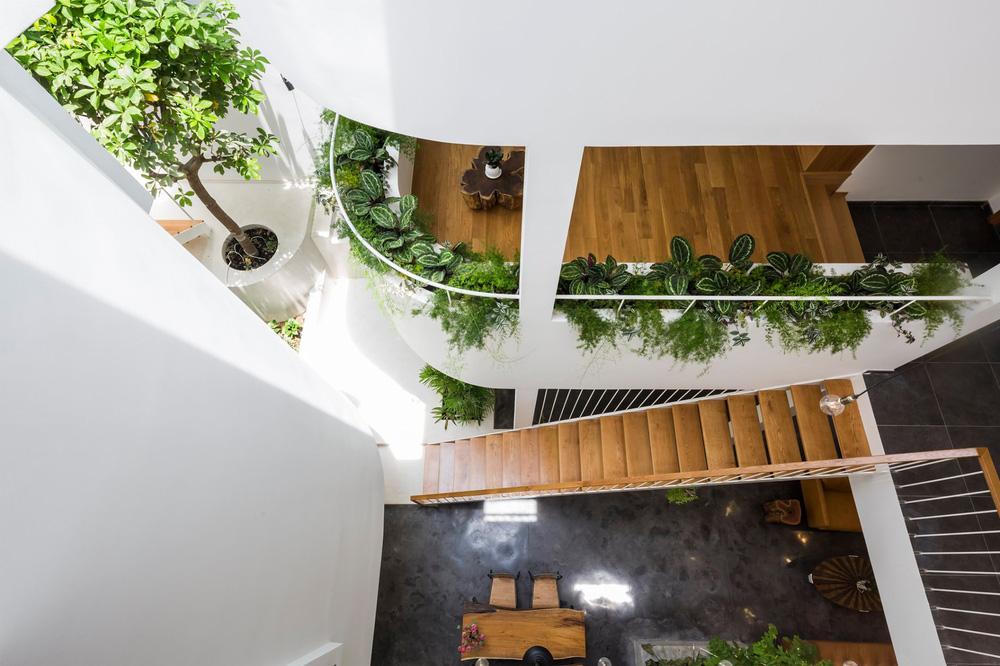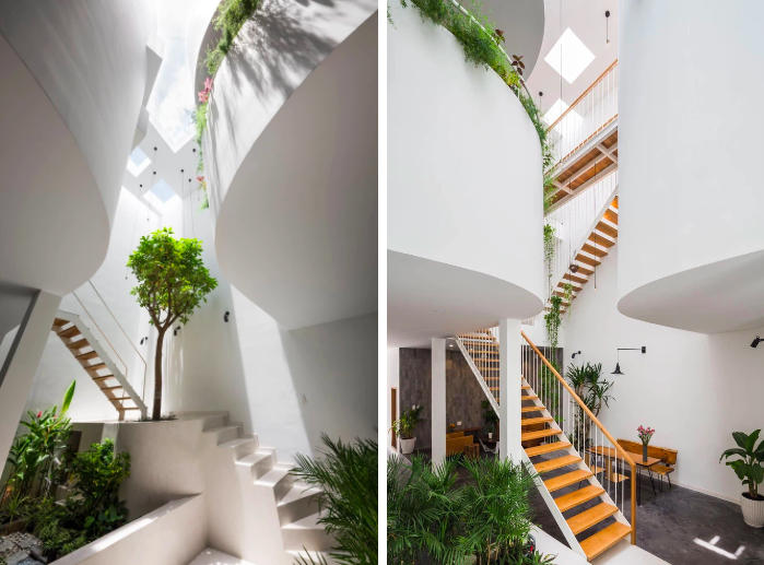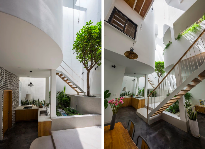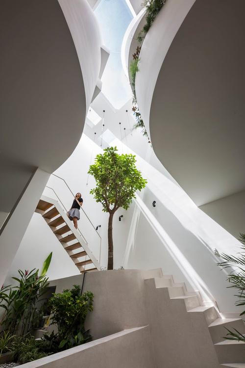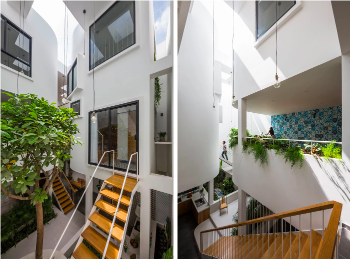 Cây xanh và cầu thang hòa quyện trong ánh sáng của khu thông tầng giếng trời |