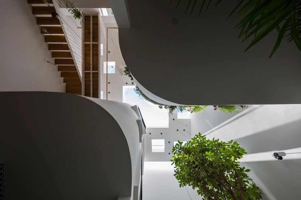 Một số đường cong được sử dụng để cắt khoét khối không gian trong nhà nhằm mục đích xóa nhòa các ranh giới giữa khu giếng trời này với khu giếng trời kia, khối không gian sinh hoạt của con gái và phần còn lại của căn nhà, phân bổ ánh sáng chan hòa mà không bị những lằn ngăn vuông vức làm gãy khúc các hiệu ứng ánh sáng và thị giác.