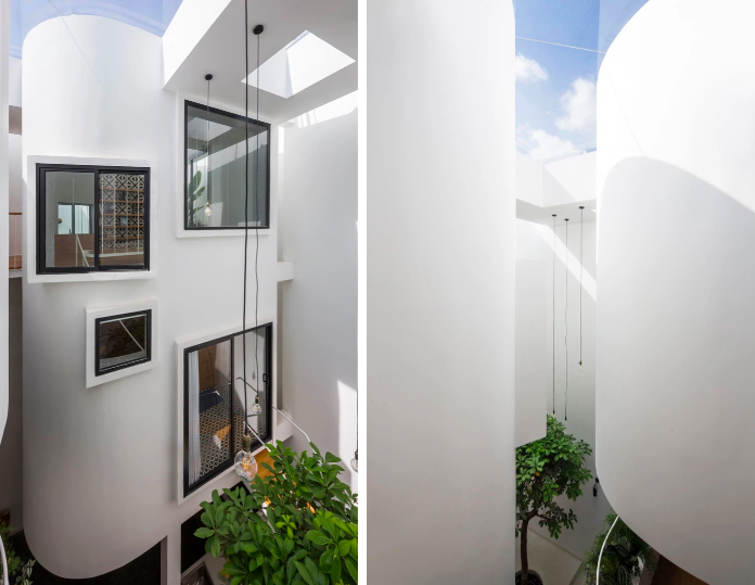 Khoảng trống thông thoáng ở trên lấy ánh sáng cho khu vực giếng trời ở giữa hai khối |