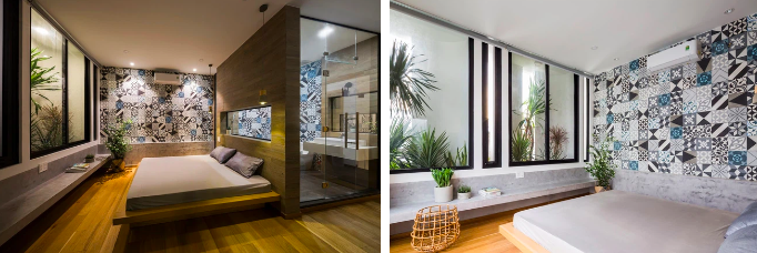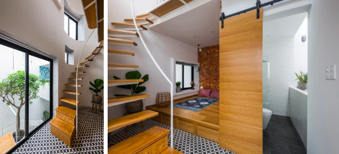 Khu nhà của cô con gái nằm ở phía sau bao gồm phòng ngủ và phòng làm việc, nhà vệ sinh thông nhau bởi 2 tầng nhà. Khu vực dành cho bố mẹ và anh trai được tách riêng phía trước gồm phòng ngủ, nhà vệ sinh. Kết nối hai không gian này là những cây cầu nối, những ô cửa sổ mở liên thông.