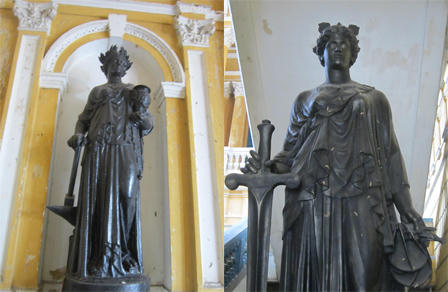 Ở tầng trệt ngay sảnh chính được bố trí hai bức tượng lớn. Tượng được bố trí hai bên chân cầu thang dẫn lên tầng hai. Bên phải là tượng nữ thần Công lý, bên trái là tượng nữ thần Đoàn kết. Ở tầng trên được bố trí bốn bức tượng lớn, nhưng không hiểu vì lý do gì mà mất một bức tượng bên cánh trái.