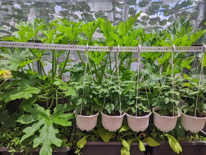 Trong vườn hiện có nhiều loại rau khác nhau. Gia chủ ưu tiên trồng các giống ngắn ngày, cho thu hoạch liên tục như rau cải, xà lách, rau muống, rau lang,... và một số loại rau gia vị như húng quế, húng lủi, rau răm, hành lá,...