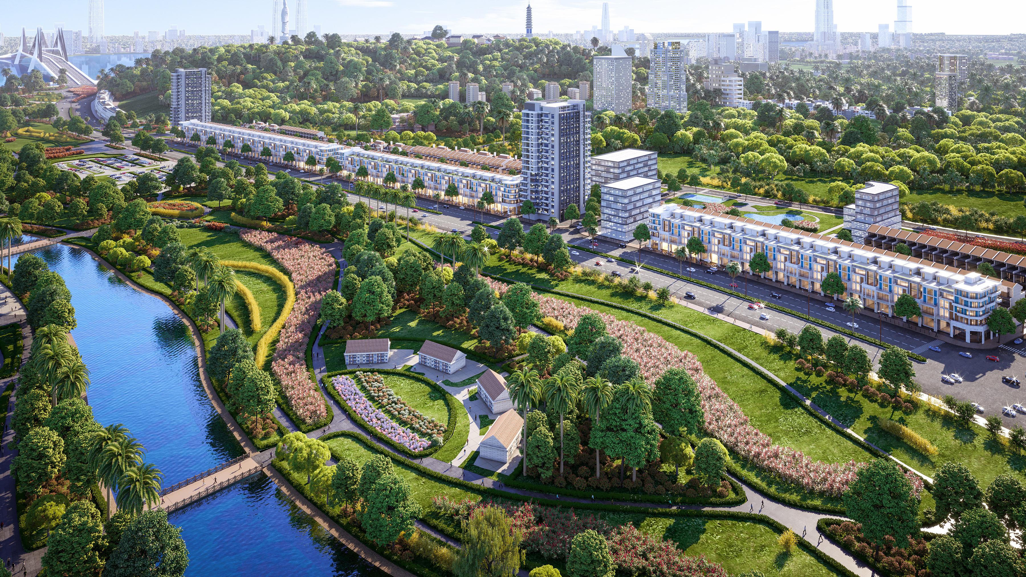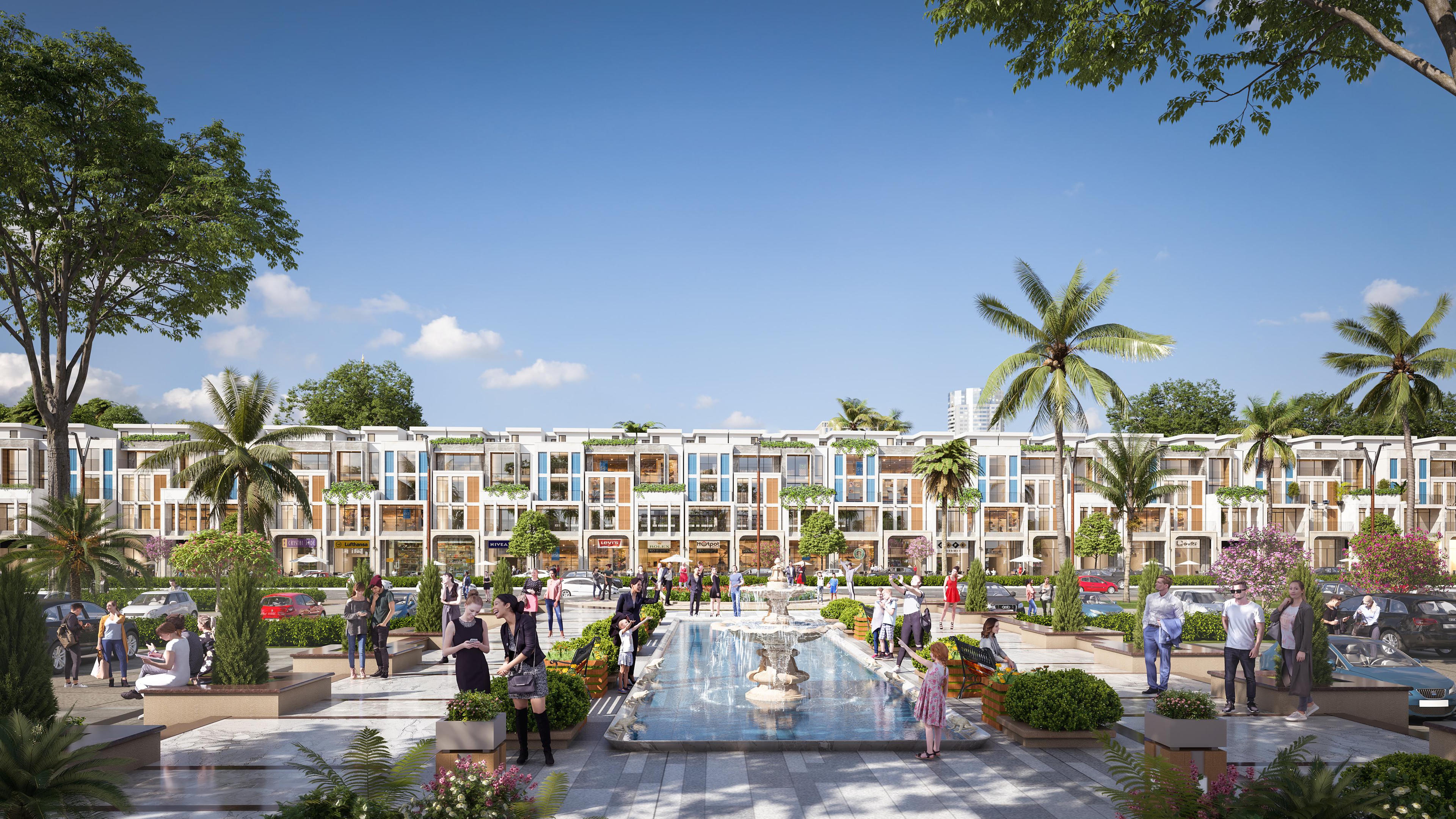 Dự án lấy dãy shophouse làm trục chính, bên cạnh đó là sự đan xen của biệt thự, nhà phố, trung tâm thương mại và công viên tạo nên thể thống nhất, hài hòa nhưng vẫn không kém phần năng động. Mỗi căn shophouse tại đây đều có thiết kế hai lối đi riêng nhằm khắc phục nhược điểm của nhà mặt phố với lối đi khu kinh doanh và lối lên tầng ở chung nhau gây bất tiện.