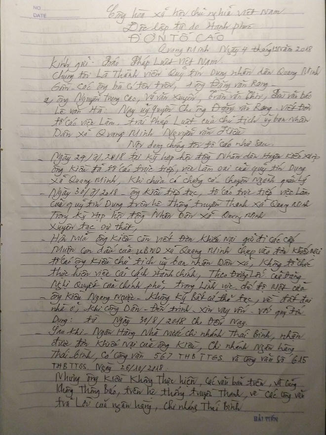 Sau quá trình làm việc với các bên liên quan, đối chiếu với các quy định của pháp luật, ngày 6/12/2018 UBND huyện Kiến Xương đã có văn bản Thông báo kết quả giải quyết tố cáo của công dân.