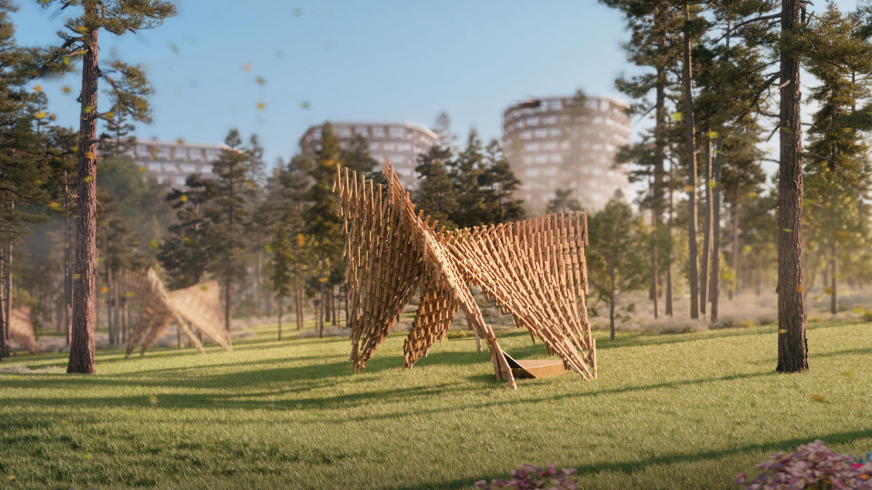 Cư dân cũng có thể nghỉ chân tại những những điểm nghỉ dưới tán thông, được thiết kế với nguồn cảm hứng từ mái vòm hình cánh bướm cao đến 5.3m, lắp ghép thủ công bằng tay từ những khối gỗ nghệ thuật riêng lẻ. Đây cũng là điểm nhấn trong nghệ thuật sắp đặt vật liệu đặc trưng của Kengo Kuma dành riêng cho Haus Da Lat.