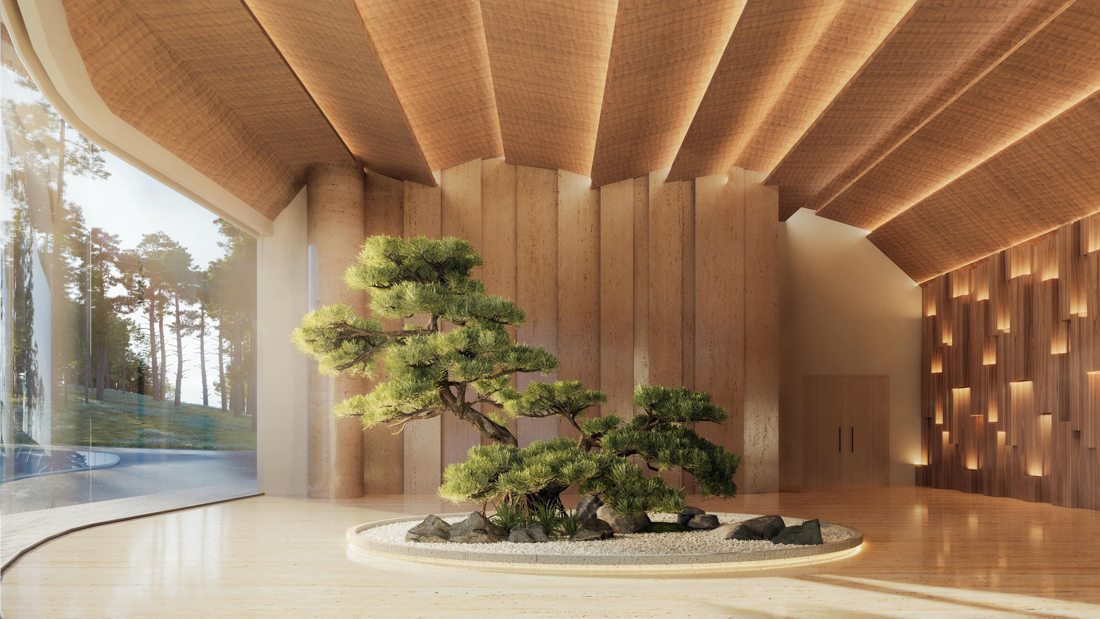 Trung tâm sảnh của tòa nhà với thiết kế được chia thành nhiều lớp xếp chồng lên nhau, gợi lên hình ảnh những tán cây trải rộng. Điều này không chỉ tăng tính thẩm mỹ mà còn cải thiện khả năng thông gió và che nắng tự nhiên. Đây vừa là biểu tượng thị giác, vừa định hình không gian ấm áp để chào đón cư dân trở về nhà.
