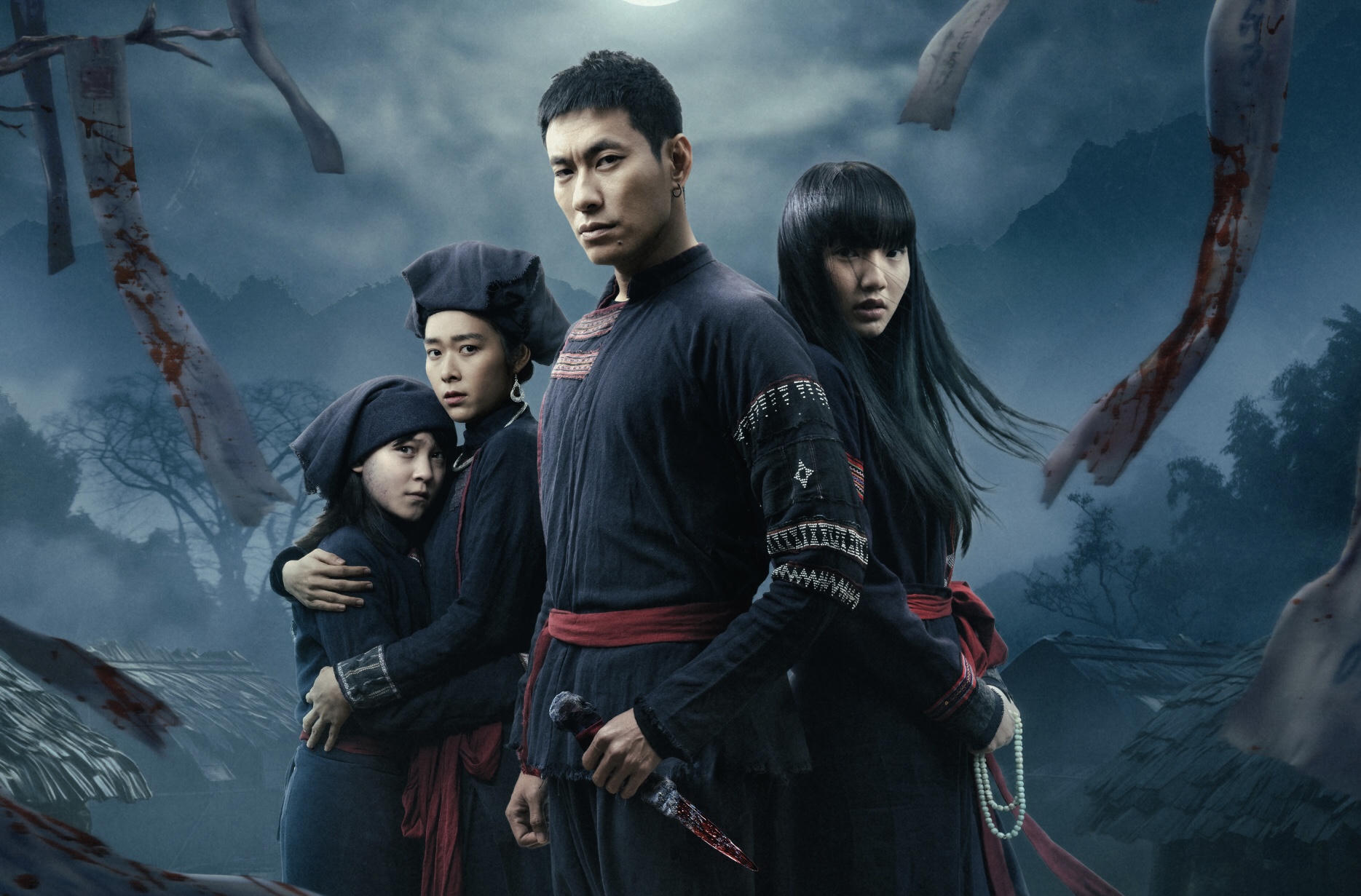 Trong hình ảnh vừa được công bố, 4 diễn viên xuất hiện trong tạo hình nhân vật vùng cao, gương mặt toát lên những biểu cảm khác nhau như phải đối mặt với một thế lực tà ác. Kiều Minh Tuấn nổi bật với ánh mắt kiên nghị cùng con dao trừ tà rướm máu trên tay, trong khi Đoàn Minh Anh gây chú ý với chuỗi tràng hạt, gợi mở vai diễn mang màu sắc tâm linh bí ẩn.