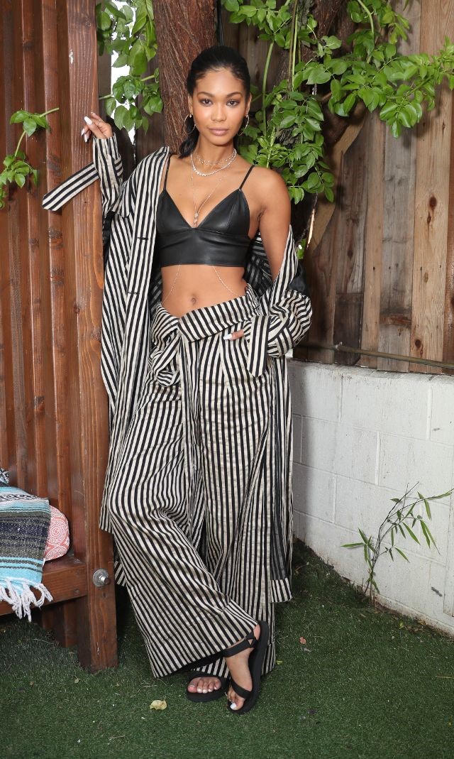 Chanel Iman cá tính trong set đồ đen trắng, điểm nhấn chính là họa tiết kẻ của quần cùng biến tấu phần cạp gập đầy mạnh mẽ.