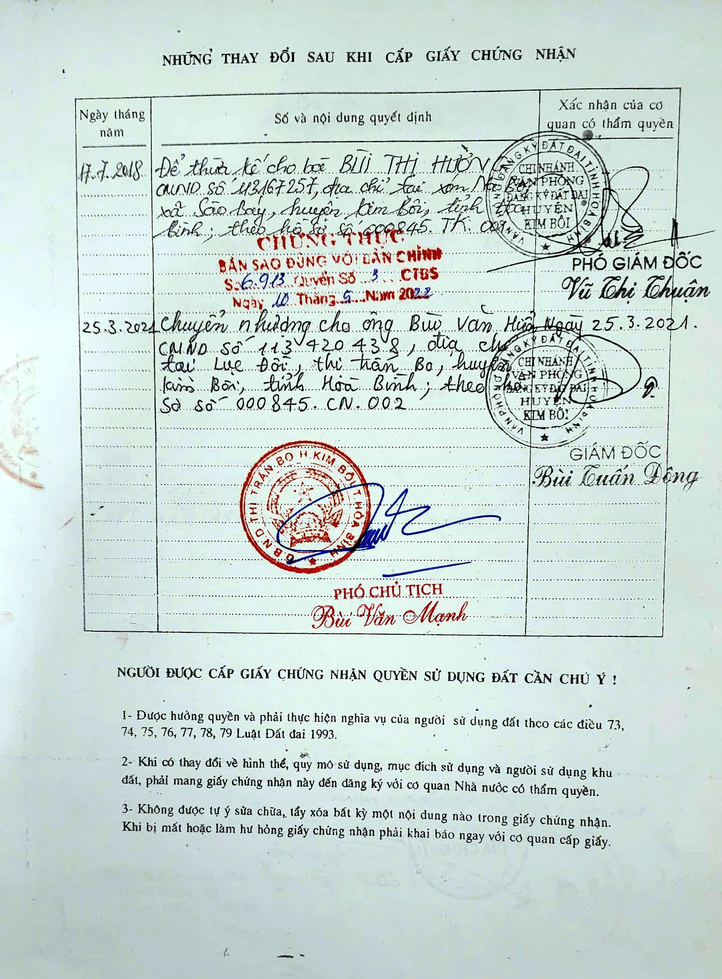Giấy chứng nhận Quyền sử dụng đất số L728926 đã được chuyển nhượng cho ông Bùi Văn Hiển theo hồ sơ số 000845.CN.002 |