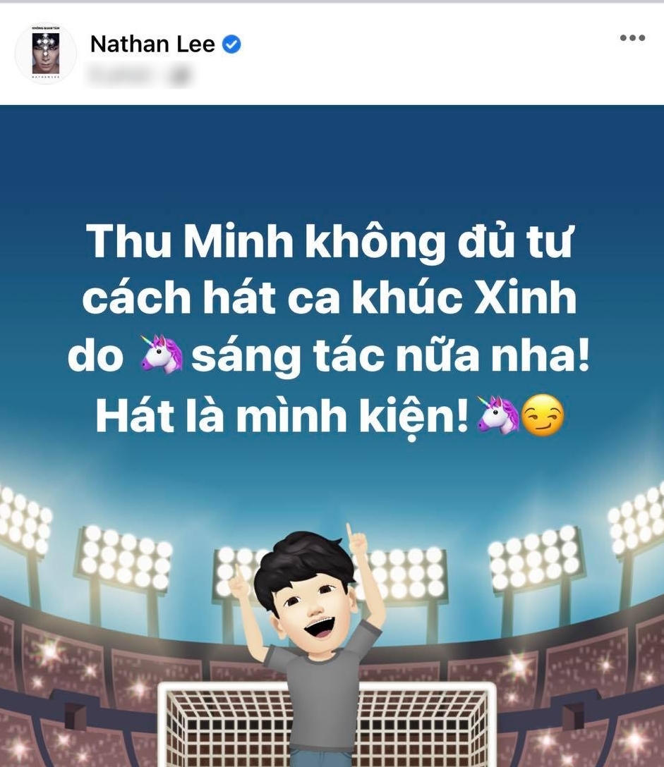 Cụ thể, Nathan Lee tuyên bố: "Thu Minh không đủ tư cách hát ca khúc Xinh do mình sáng tác. Hát là mình kiện", Xinh là một ca khúc khá nổi bật trong sự nghiệp của Thu Minh từ chất giọng cho đến lời bài hát, giai điệu. Tuy nhiên, kể từ đây nữ ca sĩ sẽ không được hát vì chính tác giả đã tuyên bố không cho cô sử dụng.